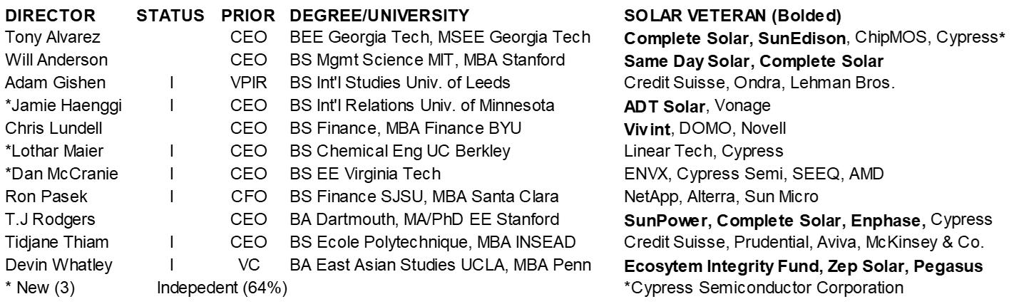 我们用三位上市公司前首席执行官董事加强了我们的董事会:ADT Solar的前首席执行官凌力尔特,该公司是一家价值14亿美元的硅谷芯片公司TERM1的前首席执行官,曾担任五家高科技公司的前董事长Dan McCranie,其中包括飞思卡尔和ON,这两家由摩托罗拉半导体公司分拆出来的上市公司;以及TERM3 Solar的前首席执行官Jamie HaenggiTERM2。