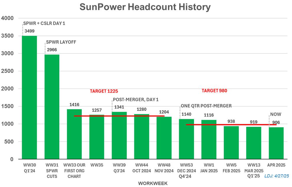 | ● | SunPower现在人员配备得体、精干.新的SunPower于2024年10月1日推出,Complete Solar、SunPower和Blue Raven Solar的总员工人数—— 3,499名员工。我们将人员配置减少了3倍,一个季度后降至1140人,如下图所示。我们对合并后公司的最终员工人数目标首先设定为1225人,然后下调至980人。我们目前拥有906名员工,领先于该计划。我们的员工人数是合适的,能够以3亿美元的年化收入实现盈利。 |