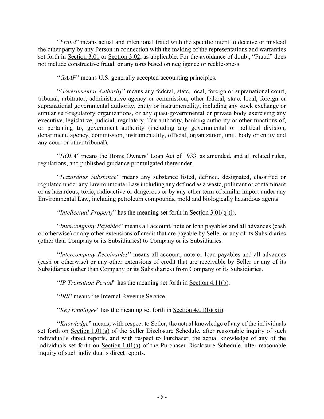 -5-“欺诈”是指任何人在作出第3.01节或第3.02节(如适用)规定的陈述和保证时,具有欺骗或误导另一方的具体意图的实际和故意欺诈。为免生疑问,“欺诈”不包括建设性欺诈,或任何基于疏忽或鲁莽的侵权行为。“GAAP”是指美国公认会计原则。“政府当局”是指任何联邦、州、地方、外国或超国家法院、法庭、仲裁员、行政机构或委员会、其他联邦、州、地方、外国或超国家政府当局、实体或工具,包括任何证券交易所或类似的自律组织,或行使任何行政、立法、司法、监管、税务当局、银行当局或政府当局(包括任何政府或政治部门、部门、机构、委员会、工具、官方、组织、单位、机构或实体以及任何法院或其他法庭)的任何准政府或私人机构。“HOLA”是指经修订的1933年《房主贷款法案》,以及根据该法案颁布的所有相关规则、条例和已发布的指导意见。“有害物质”是指根据任何环境法列出、定义、指定、分类或监管的任何物质,包括根据任何环境法定义为废物、污染物或污染物或危险、有毒、放射性或危险或任何其他类似进口术语的任何物质,包括石油化合物、霉菌和生物危险剂。“知识产权”具有第3.01(q)(i)节规定的含义。“公司间应付款项”是指卖方或其任何附属公司(公司或其附属公司除外)应付公司或其附属公司的所有应付账款、票据或贷款以及所有预付款(现金或其他)或任何其他信贷延期。“公司间应收款”是指卖方或其任何子公司(公司或其子公司除外)应收公司或其子公司的所有应付账款、票据或贷款以及所有预付款(现金或其他)或任何其他信贷展期。“知识产权过渡期”具有第4.11(b)节规定的含义。“IRS”是指美国国税局。“关键员工”具有第4.01(b)(xii)节中规定的含义。“知悉”是指,就卖方而言,在合理查询该个人的直接报告后,卖方披露附表第1.01(a)节所列的任何个人的实际知悉情况;就买方而言,在合理查询该个人的直接报告后,买方披露附表第1.01(a)节所列的任何个人的实际知悉情况。