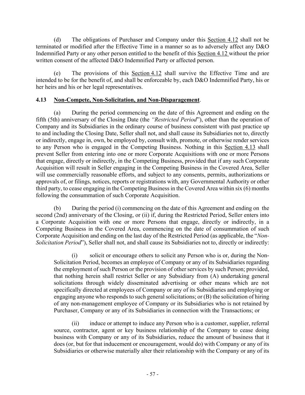 -57-(d)买方和公司根据本条第4.12条所承担的义务,不得在生效时间后终止或修改,以致对任何D & O获弥偿方或任何其他有权获得本条第4.12条利益的人产生不利影响,而无需事先获得受影响的D & O获弥偿方或受影响人的书面同意。(e)本条第4.12条的规定在生效时间内有效,旨在为每一D & O获弥偿方、其继承人及其法定代表人的利益服务,并可由其强制执行。4.13不竞争、不招揽、不诋毁。(a)在自本协议日期开始至截止日期第五(5)周年结束的期间(“限制期”)内,除公司及其附属公司在截至截止日期(包括截止日期)的符合以往惯例的正常业务过程中的运营外,卖方不得且应促使其附属公司直接或间接从事、拥有、受雇于任何从事竞争业务的人、与其协商、促进或以其他方式向其提供服务。本条第4.13款的任何规定均不得阻止卖方与一名或多名直接或间接从事竞争业务的人进行一项或多项公司收购,但前提是,如果任何此类公司收购将导致卖方在涵盖区域内从事竞争业务,卖方将作出商业上合理的努力,并在获得任何政府当局或其他第三方的任何同意、许可、授权或批准,或向其备案、通知、报告或登记的情况下,于该等公司收购事项完成后六(6)个月内停止在涵盖区域内从事竞争业务。(b)在(i)自本协议日期开始至交割第二(2)周年结束的期间内,或(ii)如在限制期内,卖方与一名或多于一名直接或间接在涵盖区域内从事竞争性业务的人士订立公司收购事项,自该公司收购事项完成之日起至限制期最后一天(如适用,“非招揽期”)结束,卖方不得且应促使其子公司不得,直接或间接:(i)就雇用该人或由该人提供其他服务而招揽或鼓励他人招揽任何现为或在非招揽期间成为公司或其任何附属公司雇员的人;但,此处的任何规定均不得限制卖方或任何附属公司(a)通过广泛传播的广告或其他非专门针对公司或其任何附属公司的雇员的方式进行一般性招揽,并雇用或聘用对此类一般性招揽作出回应的任何人;或(b)招揽雇用公司或其附属公司的任何非管理雇员,而这些雇员并未被买方、公司或其任何附属公司与交易有关的保留;或(ii)诱导或试图诱导任何作为客户、供应商、推荐来源、承包商的人,公司的代理人或关键业务关系,以停止与公司或其任何子公司开展业务,减少其与公司或其任何子公司开展(或,如果没有这种诱导或鼓励,将会这样做)的业务数量,或以其他方式实质性改变其与公司或其任何子公司的关系