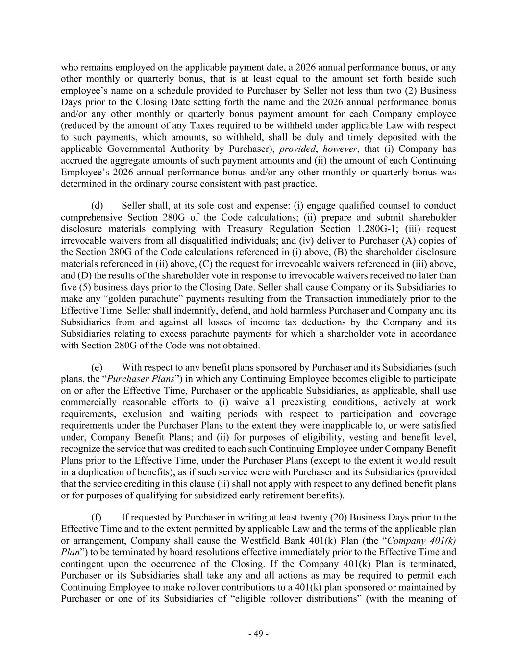 -49-在适用的付款日期、2026年年度绩效奖金或任何其他月度或季度奖金继续受雇的人,其数额至少等于卖方提供给买方的附表上列明该雇员姓名和2026年年度绩效奖金和/或每名公司雇员的任何其他月度或季度奖金付款金额的截止日期前不少于两(2)个工作日的金额(减去根据适用法律要求就此种付款预扣的任何税款的数额,如此扣留的金额,应由买方适当和及时地存入适用的政府当局),但前提是(i)公司已累计此类付款金额的总额,以及(ii)每位持续雇员的2026年年度绩效奖金和/或任何其他月度或季度奖金的金额是按照以往惯例在正常过程中确定的。(d)卖方应自费:(i)聘请合格的大律师进行全面的《守则》第280G条计算;(ii)编制和提交符合《财政部条例》第1.280G-1条的股东披露材料;(iii)要求所有不合格的个人作出不可撤销的放弃;(iv)向买方交付(a)上述(i)中提及的《守则》第280G条计算的副本,(b)上述(ii)中提及的股东披露材料,(c)上述(iii)中提及的不可撤销的放弃请求,及(d)不迟于截止日期前五(5)个营业日收到的针对不可撤销豁免的股东投票结果。卖方应促使公司或其子公司在紧接生效时间之前支付因交易产生的任何“金降落伞”付款。卖方应赔偿、抗辩并使买方和公司及其子公司免受公司及其子公司因未获得根据《守则》第280G节的股东投票而产生的与超额降落伞付款有关的所得税扣除的所有损失。(e)对于任何持续雇员在生效时间或之后有资格参与的由买方及其子公司发起的任何福利计划(此类计划,“买方计划”),买方或适用的子公司(如适用)应通过商业上合理的努力(i)在不适用于公司福利计划或在公司福利计划下得到满足的范围内,放弃与买方计划下的参与和覆盖要求有关的所有先前存在的条件、积极的工作要求、排除和等待期;以及(ii)出于资格、归属和福利水平的目的,确认在生效时间之前根据公司福利计划、在买方计划下记入每位此类持续雇员的服务(除非会导致福利重复),如同此类服务是为买方及其子公司提供的(前提是本条款(ii)中的服务记入不适用于任何设定受益计划或为有资格获得补贴的提前退休福利的目的)。(f)如买方在生效时间前至少二十(20)个营业日提出书面要求,并在适用法律和适用计划或安排条款允许的范围内,公司应促使Westfield Bank 401(k)计划(“公司401(k)计划”)由紧接生效时间之前生效的董事会决议终止,并视交割的发生而定。倘公司401(k)计划终止,买方或其附属公司须采取可能需要的任何及所有行动,以容许每名持续雇员向由买方或其附属公司之一赞助或维持的401(k)计划作出转期供款的「合资格转期分配」(涵义为
