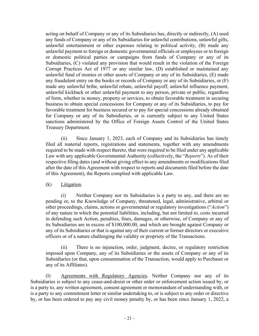 -21-代表公司或其任何子公司直接或间接地(a)使用公司或其任何子公司的任何资金进行非法捐款、非法馈赠、非法娱乐或与政治活动有关的其他费用,(b)使用公司或其任何子公司的资金向外国或国内政府官员或雇员或外国或国内政党或竞选活动进行任何非法付款,(c)违反任何将导致违反1977年《反海外腐败法》或任何类似法律的规定,(d)设立或维持公司或其任何附属公司的任何非法款项或其他资产,(e)在公司或其任何附属公司的簿册或记录上作出任何欺诈记项,或(f)向任何人作出任何非法贿赂、非法回扣、非法付款、非法影响付款、非法回扣或其他非法付款,不论形式,不论是金钱、财产或服务,以取得有利的待遇,以确保业务为公司或其任何附属公司取得特别优惠,为担保业务支付优惠待遇或为公司或其任何子公司已获得的特殊特许权支付费用,或目前受到美国财政部外国资产控制办公室管理的任何美国制裁。(ii)自2023年1月1日起,各公司及其附属公司已及时向任何适用的政府当局提交根据任何适用法律规定须提交的所有重要报告、登记和报表,以及与此相关的任何修订(统称“报告”)。自各自提交之日起(且未对在本协议日期之前提交的报告和文件实施在本协议日期之后提交的任何修订或修改),这些报告符合适用法律。(k)诉讼。(i)公司或其子公司均不是任何诉讼的当事方,并且不存在任何未决的或据公司所知的威胁的法律、行政、仲裁或其他程序、索赔、行动或任何性质的政府或监管调查(“行动”),其中的潜在责任,包括但不限于公司或其任何子公司为此类诉讼辩护所产生的费用、罚款、罚款、损害赔偿或其他方面超过100,000.00美元,以及针对公司或其任何附属公司或针对其任何现任或前任董事或执行官或对交易的有效性或适当性提出质疑的性质。(ii)没有对公司、其任何附属公司或公司或其任何附属公司的资产施加强制令、命令、判决、判令或监管限制(或在交易完成后将适用于买方或其任何附属公司)。(l)与监管机构的协议。本公司或其任何附属公司均不受任何书面协议、同意协议或谅解备忘录所发出的任何停止或其他命令或强制执行行动的规限,或为与其订立的任何书面协议、同意协议或谅解备忘录的订约方,或为任何承诺函或类似承诺的订约方,或受任何命令或指示规限,或已被命令支付任何民事罚款,或自2022年1月1日起已