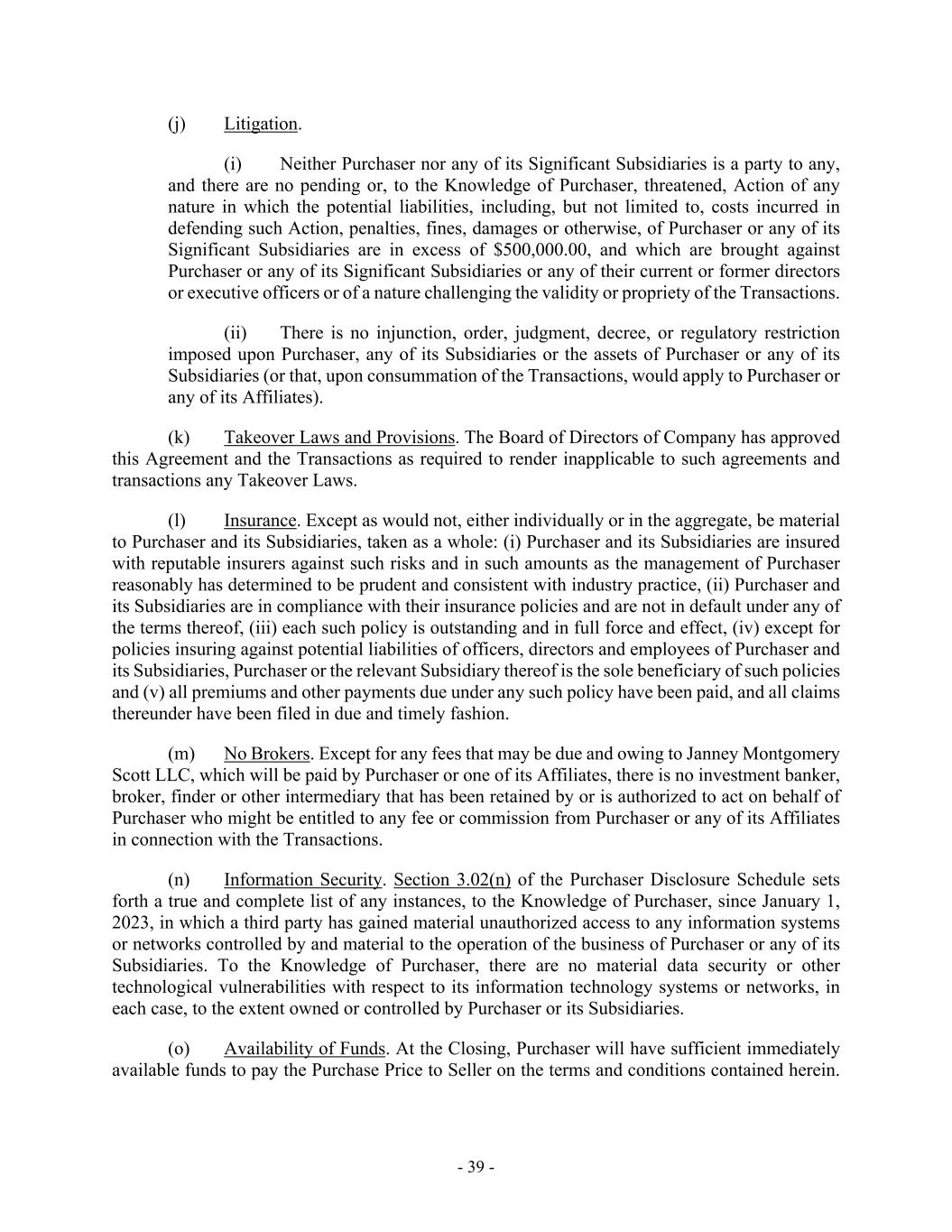 -39-(j)诉讼。(i)买方或其任何重要子公司均不是任何一方的当事方,并且不存在任何潜在责任性质的未决或据买方所知受到威胁的行动,其中包括但不限于买方或其任何重要子公司为此类行动辩护所产生的费用、罚款、罚款、损害赔偿或其他方面的费用超过500,000.00美元,这些费用是针对买方或其任何重要子公司或其任何现任或前任董事或执行官或具有质疑交易有效性或正当性的性质的。(ii)不存在对买方、其任何附属公司或买方或其任何附属公司的资产施加的强制令、命令、判决、法令或监管限制(或在交易完成后将适用于买方或其任何附属公司)。(k)接管法律和规定。公司董事会已按规定批准本协议及交易,使任何收购法律不适用于该等协议及交易。(l)保险。除个别或总体上对买方及其附属公司不重要外,作为一个整体:(i)买方及其附属公司向信誉良好的保险人投保此类风险和金额,买方管理层合理地确定为审慎且符合行业惯例,(ii)买方及其附属公司遵守其保险单,且在任何条款下均未违约,(iii)每份此类保单均未执行且完全有效,(iv)除针对买方及其子公司的高级职员、董事和雇员的潜在责任投保的保单外,买方或其相关子公司是此类保单的唯一受益人,并且(v)根据任何此类保单到期的所有保费和其他付款均已支付,并且根据该保单提出的所有索赔均已到期且及时。(m)没有经纪人。除了可能到期并应支付给Janney Montgomery Scott LLC的任何费用(将由买方或其关联公司之一支付)外,没有投资银行家、经纪人、发现者或其他中间人被买方保留或被授权代表买方行事,他们可能有权从买方或其任何关联公司获得与交易有关的任何费用或佣金。(n)信息安全。买方披露附表第3.02(n)节列出了自2023年1月1日以来,据买方所知,第三方未经授权获得对买方或其任何子公司的业务运营所控制的任何信息系统或网络的重大访问的任何实例的真实完整清单。据买方所知,在每种情况下,在买方或其子公司拥有或控制的范围内,其信息技术系统或网络不存在重大数据安全或其他技术漏洞。(o)资金到位情况。在交割时,买方将有足够的立即可用资金根据此处包含的条款和条件向卖方支付购买价格。