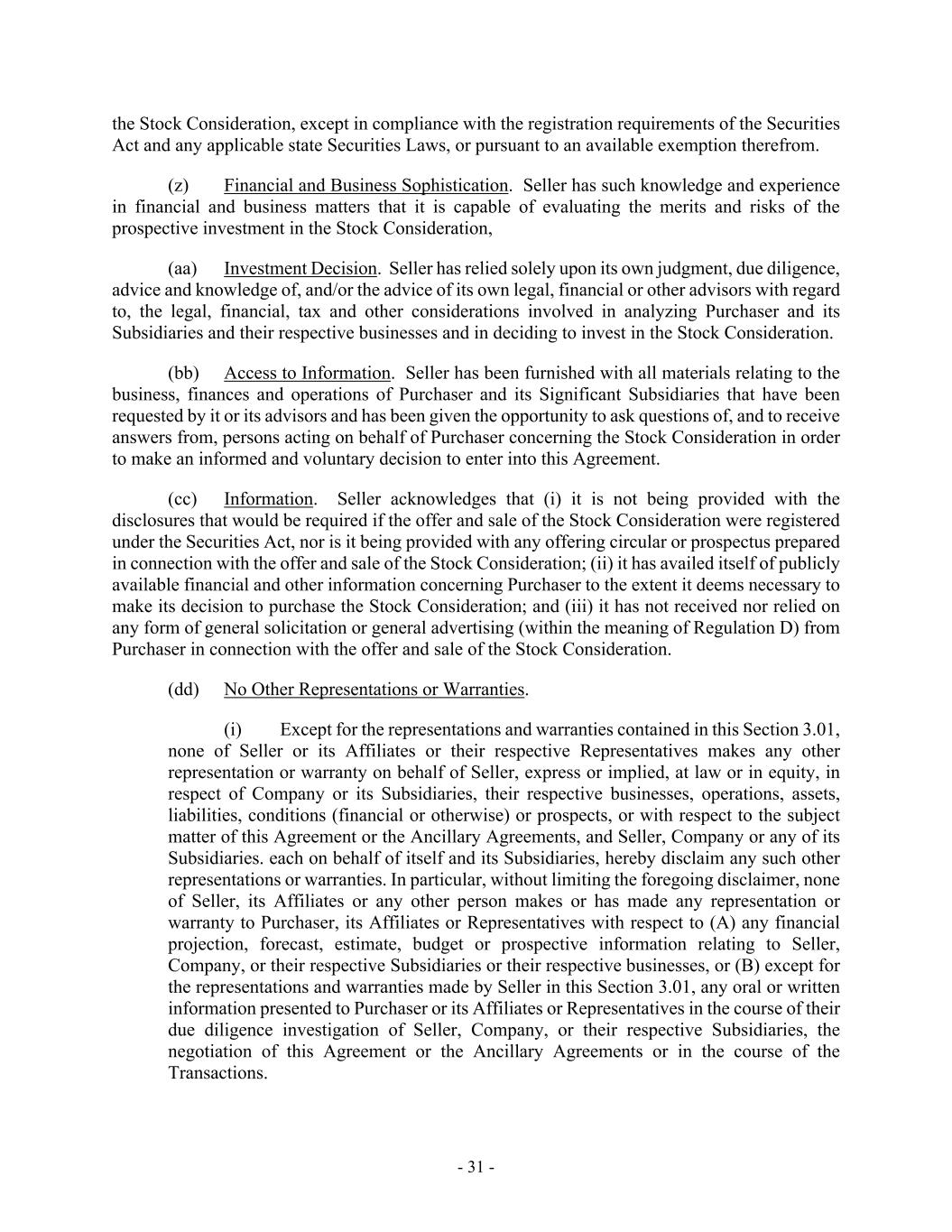 -31-股票对价,除非符合《证券法》和任何适用的州证券法的注册要求,或根据可获得的豁免。(z)财务和业务复杂性。卖方在财务和商业事务方面具有这样的知识和经验,它能够评估股票对价的预期投资的优点和风险,(aa)投资决策。卖方在分析买方及其子公司及其各自业务以及决定投资于股票对价时,完全依赖其自己的判断、尽职调查、建议和对法律、财务或其他顾问的了解,和/或其自己的法律、财务、税务和其他考虑因素的建议。(bb)获取信息。卖方已获得其或其顾问要求的与买方及其重要子公司的业务、财务和运营有关的所有材料,并有机会就股票对价向代表买方行事的人提出问题并获得其答复,以便就订立本协议作出知情和自愿的决定。(CC)信息。卖方承认,(i)如果根据《证券法》登记股票对价的要约和出售,则未向其提供所需的披露,亦无向其提供任何就要约及出售股票代价而拟备的发售通函或招股章程;(ii)其已在其认为作出购买股票代价的决定所需的范围内利用有关买方的公开财务及其他资料;及(iii)其并无就要约及出售股票代价而从买方收到或依赖任何形式的一般招标或一般广告(在条例D的涵义内)。(dd)无其他申述或保证。(i)除本第3.01条所载的陈述和保证外,卖方或其关联公司或其各自的代表均不代表卖方就公司或其子公司、其各自的业务、运营、资产、负债、条件(财务或其他)或前景,或就本协议或附属协议的标的事项,以及卖方、公司或其任何子公司,在法律上或股权上明示或默示作出任何其他陈述或保证。各自代表其本身及其子公司,特此否认任何此类其他陈述或保证。特别是,在不限制上述免责声明的情况下,卖方、其关联公司或任何其他人均未就(a)与卖方、公司或其各自子公司或其各自业务有关的任何财务预测、预测、估计、预算或预期信息,或(b)除卖方在本节3.01中作出的陈述和保证外,向买方或其关联公司或代表在其对卖方、公司或其各自子公司的尽职调查过程中提出的任何口头或书面信息,向买方、其关联公司或代表作出或已经作出任何陈述或保证,本协议或附属协议的谈判或交易过程中的谈判。