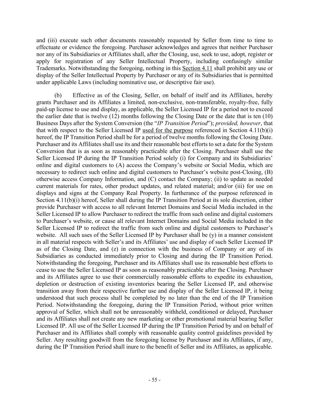 -55-和(iii)执行卖方不时合理要求的其他文件,以实现或证明前述内容。买方承认并同意,买方或其任何子公司或关联公司均不得在交割后使用、寻求使用、采纳、注册或申请注册任何卖方知识产权,包括混淆相似的商标。尽管有上述规定,本第4.11节中的任何规定均不得禁止买方或其任何子公司使用或展示适用法律允许的卖方知识产权(包括名义使用或描述性合理使用)。(b)自交割时起生效,卖方代表其自身及其关联公司特此授予买方及其关联公司有限、非排他性、不可转让、免版税、全额缴款的许可,以在不超过截止日期后十二(12)个月的较早日期或系统转换后十(10)个工作日的日期(“IP过渡期”)的情况下使用和展示(如适用)卖方许可的知识产权;但前提是,就用于本协议第4.11(b)(i)节所述目的的卖方许可的知识产权而言,知识产权过渡期为截止日期后的十二个月。买方及其附属公司应尽其及合理的最大努力在交割后合理可行的情况下尽快确定系统转换的日期。买方应在知识产权过渡期内仅(i)为公司及其子公司的在线和数字客户使用卖方许可的知识产权,以便(a)访问公司网站或社交媒体,这是在交易结束后将此类在线和数字客户重定向到买方网站所必需的,(b)以其他方式访问公司信息,以及(c)联系公司;(ii)根据需要更新费率、其他产品更新和相关材料的当前材料;和/或(iii)用于公司不动产的展示和标志。为促进本协议第4.11(b)(i)节中提及的目的,卖方应在知识产权过渡期内自行决定,要么向买方提供对卖方许可知识产权中包含的所有相关互联网域名和社交媒体的访问权限,以允许买方将此类在线和数字客户的流量重定向到买方网站,要么促使卖方许可知识产权中包含的所有相关互联网域名和社交媒体将此类在线和数字客户的流量重定向到买方网站。买方对卖方许可知识产权的所有此类使用应(y)在所有重大方面与卖方及其关联公司在截止日期使用和展示此类卖方许可知识产权的方式一致,以及(z)与公司或其任何子公司在紧接截止日期之前和知识产权过渡期内进行的业务有关。尽管有上述规定,买方及其关联公司应尽其合理的最大努力,在交割后在合理可行的范围内尽快停止使用卖方许可的知识产权。买方及其关联公司同意使用其商业上合理的努力,以加快其用尽、耗尽或销毁带有卖方许可知识产权的现有库存,并以其他方式过渡离开其各自对卖方许可知识产权的进一步使用和展示,据了解,该过程应在不迟于知识产权过渡期结束之前完成。尽管有上述规定,在知识产权过渡期内,未经卖方事先书面批准,不得无理扣留、附加条件或延迟,买方及其关联公司不得创建任何带有卖方许可知识产权的新营销或其他宣传材料。买方及其关联公司及其代表在知识产权过渡期内对卖方许可知识产权的所有使用均应遵守卖方提供的合理质量控制准则。买方及其关联公司(如有)在知识产权过渡期内因上述许可而产生的任何商誉应符合卖方及其关联公司(如适用)的利益。