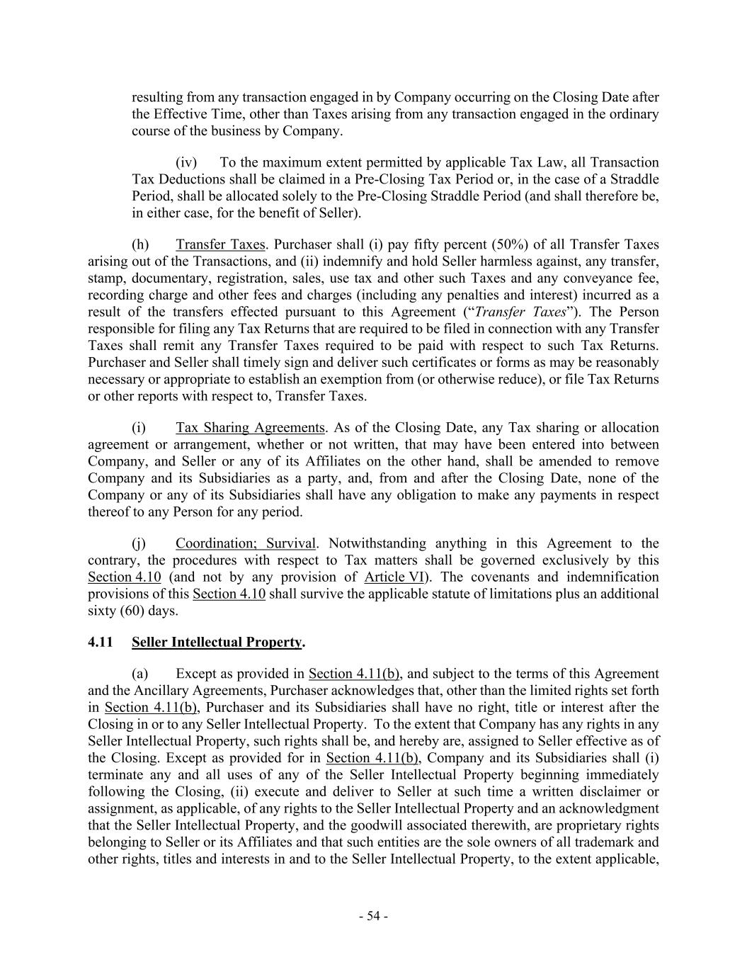 -54-公司所从事的任何交易在生效时间后的截止日期发生,但公司在正常业务过程中所从事的任何交易所产生的税项除外。(iv)在适用的税法允许的最大限度内,所有交易税收减免应在一个收盘前的税期内主张,或者,在跨座期的情况下,应仅分配给收盘前的跨座期(因此,在任何一种情况下,均应为卖方的利益)。(h)转让税。买方应(i)支付交易产生的所有转让税款的百分之五十(50%),以及(ii)赔偿并使卖方免受任何转让、盖章、跟单、登记、销售、使用税和其他此类税款以及因根据本协议进行的转让而产生的任何转让费、记录费和其他费用和收费(包括任何罚款和利息)(“转让税”)的损害。负责报备与任何转移税有关的任何须予报备的税务申报表的人,须汇交与该等税务申报表有关的任何须予缴付的转移税。买卖双方应及时签署和交付合理必要或适当的证明或表格,以确立对转移税的豁免(或以其他方式减少),或提交纳税申报表或其他有关转移税的报告。(i)分税协议。自截止日期起,公司与卖方或其任何附属公司之间可能订立的任何税务分担或分配协议或安排(不论是否书面),须予修订,以取消公司及其附属公司作为一方,且自截止日期起及之后,公司或其任何附属公司概无义务就任何期间向任何人支付任何有关款项。(j)协调;生存。尽管本协议中有任何相反的规定,有关税务事项的程序应完全受本第4.10条(而不是第六条的任何规定)管辖。本条第4.10条的契诺及赔偿条文,须在适用的诉讼时效加上额外六十(60)天后继续有效。4.11卖方知识产权。(a)除第4.11(b)节规定的情况外,在遵守本协议和附属协议条款的情况下,买方承认,除第4.11(b)节规定的有限权利外,买方及其子公司在任何卖方知识产权交割后或对任何卖方知识产权不享有任何权利、所有权或权益。在公司对任何卖方知识产权拥有任何权利的范围内,该等权利应并在此转让给卖方,自交割时起生效。除第4.11(b)节另有规定外,公司及其子公司应(i)终止紧随交割后开始的对卖方任何知识产权的任何和所有使用,(ii)在该时间签署并向卖方交付对卖方知识产权的任何权利的书面免责声明或转让(如适用),并确认卖方知识产权以及与之相关的商誉是属于卖方或其关联公司的所有权,并且这些实体是所有商标和其他权利的唯一所有者,在适用的范围内,卖方知识产权的所有权和权益,
