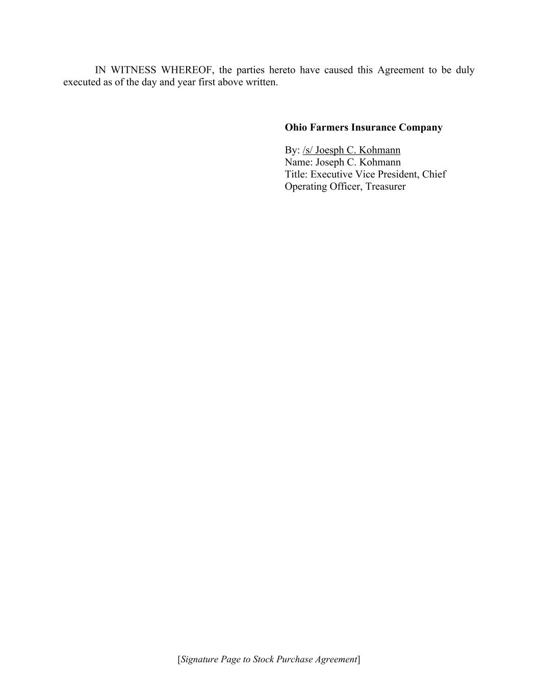 [股票购买协议签署页]作为证明,本协议各方已促使本协议自上述日期和年份之日起正式签署。Ohio Farmers Insurance Company by:/s/Joesph C. Kohmann Name:Joseph C. Kohmann Title:Executive Vice President,Chief Operating Officer,Treasurer