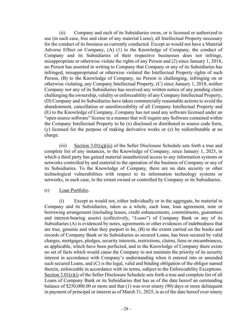 -28-(ii)公司及其每个子公司拥有或获得许可或授权使用(在每种情况下,没有任何重大留置权)目前开展业务所需的所有知识产权。除不会对公司造成重大不利影响外,(a)(1)据公司知悉,公司及其附属公司各自业务的进行并无侵犯、挪用或以其他方式侵犯任何人的权利,及(2)自2018年1月1日起,无人向公司书面声称公司或其任何附属公司侵犯、挪用或以其他方式侵犯该人的知识产权,(b)据公司知悉,无人质疑、侵犯或以其他方式侵犯任何公司的知识产权,(c)自1月1日起,2018年,公司或其任何子公司均未收到任何质疑任何公司知识产权的所有权、有效性或可执行性的未决索赔的书面通知,(d)公司及其子公司已采取商业上合理的行动,以避免所有公司知识产权被放弃、取消或不可执行性,以及(e)据公司所知,公司未使用任何根据“开源软件”许可获得许可的软件,其方式将要求公司知识产权中包含的任何软件以源代码形式披露或分发,(y)为制作衍生作品而获许可或(z)可免费再分配。(iii)卖方披露附表第3.01(q)(iii)节列出了自2023年1月1日以来,据公司所知,第三方未经授权获得对公司或其任何子公司的业务运营所控制的任何信息系统或网络的重大访问的任何情况的真实完整清单。据公司所知,在每种情况下,在公司或其子公司拥有或控制的范围内,其信息技术系统或网络不存在数据安全或其他技术漏洞。(r)贷款组合。(i)公司银行或其任何子公司的每笔贷款、贷款协议、票据或借款安排(包括租赁、增信、承诺、担保和生息资产)(统称“贷款”)(a)均以票据、协议或其他债务证据为证据,这些证据是真实、真实的和它们所声称的,(b)在公司银行或其子公司作为担保贷款的账簿和记录上所载的范围内,已由有效的押记、抵押、质押作担保,担保权益、限制、债权、留置权或产权负担(如适用)已完善,并且据公司所知,不存在会导致公司在订立或修改此类担保贷款时不按照公司的理解维持其担保权益的优先权的一组事实,并且(c)是其中指定的债务人的合法、有效和具有约束力的义务,可根据其条款强制执行,但可执行性例外情况除外。卖方披露附表第3.01(r)(i)节列出了公司银行或其子公司的所有贷款的真实完整清单,这些贷款截至本协议之日的未偿余额为250,000.00美元或更多,而截至2025年3月31日,(1)已拖欠本金或利息超过九十(90)天或更多,截至本协议之日超过九十