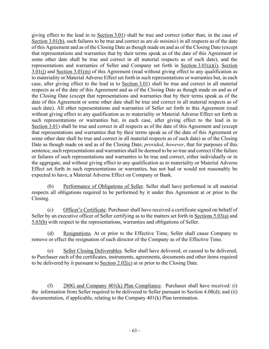 -63-使第3.01条的引线生效)在截至本协议日期的所有方面均应是真实和正确的(但在第3.01(b)条的情况下,如未能达到最低限度的真实和正确,则除外),并且截至截止日期,犹如在截止日期和截止日期作出的一样(但根据其条款在本协议日期或某些其他日期所述的陈述和保证在截至该日期的所有重大方面均应是真实和正确的除外),以及本协议第3.01(a)(i)节、第3.01(j)节和第3.01(m)节中规定的卖方和公司的陈述和保证(理解为不影响此类陈述或保证中所述的关于重要性或重大不利影响的任何限定条件,但在每种情况下,在第3.01条的引线生效后)在截至本协议日期和截止日期的所有重大方面均应是真实和正确的,犹如在截止日期和截止日期作出的一样(但根据其条款所说的截至本协议日期或某些其他日期的陈述和保证在截至该日期的所有重大方面均应是真实和正确的除外)。本协议中规定的卖方的所有其他陈述和保证(理解为不影响此类陈述或保证中规定的关于重要性或重大不利影响的任何限定,但在每种情况下,在第3.01条的引线生效后)应在本协议日期的所有方面都是真实和正确的,并且(但根据其条款所说的截至本协议日期或某些其他日期的陈述和保证应在所有重大方面截至该日期是真实和正确的)截至截止日期,如同在截止日期和截至截止日期作出的一样;但条件是,就本句而言,如果此类陈述和保证的失败或失败是真实和正确的,无论是单独的还是总体的,并且没有使此类陈述或保证中所述的关于重要性或重大不利影响的任何限定生效,则此类陈述和保证应被视为如此真实和正确,没有或不会合理地预期会对公司或银行产生重大不利影响。(b)履行卖方的义务。卖方应已在所有重大方面履行了其在交割时或交割前根据本协议要求履行的所有义务。(c)人员证明书。买方应已收到由卖方执行官员代表卖方签署的证明,证明第5.03(a)和5.03(b)节中关于卖方的陈述、保证和义务的事项。(d)辞职。在生效时间或之前,卖方应促使公司罢免或实施自生效时间起公司每位董事的辞职。(e)卖方关闭可交付成果。卖方应已在截止日期或之前向买方交付或安排交付其根据第2.02(c)节要求交付的每一份证书、文书、协议、文件和其他物品。(f)280G和公司401(k)计划合规。买方应已收到:(i)根据第4.08(d)节要求交付给卖方的卖方信息;(ii)与公司401(k)计划终止有关的文件(如适用)。