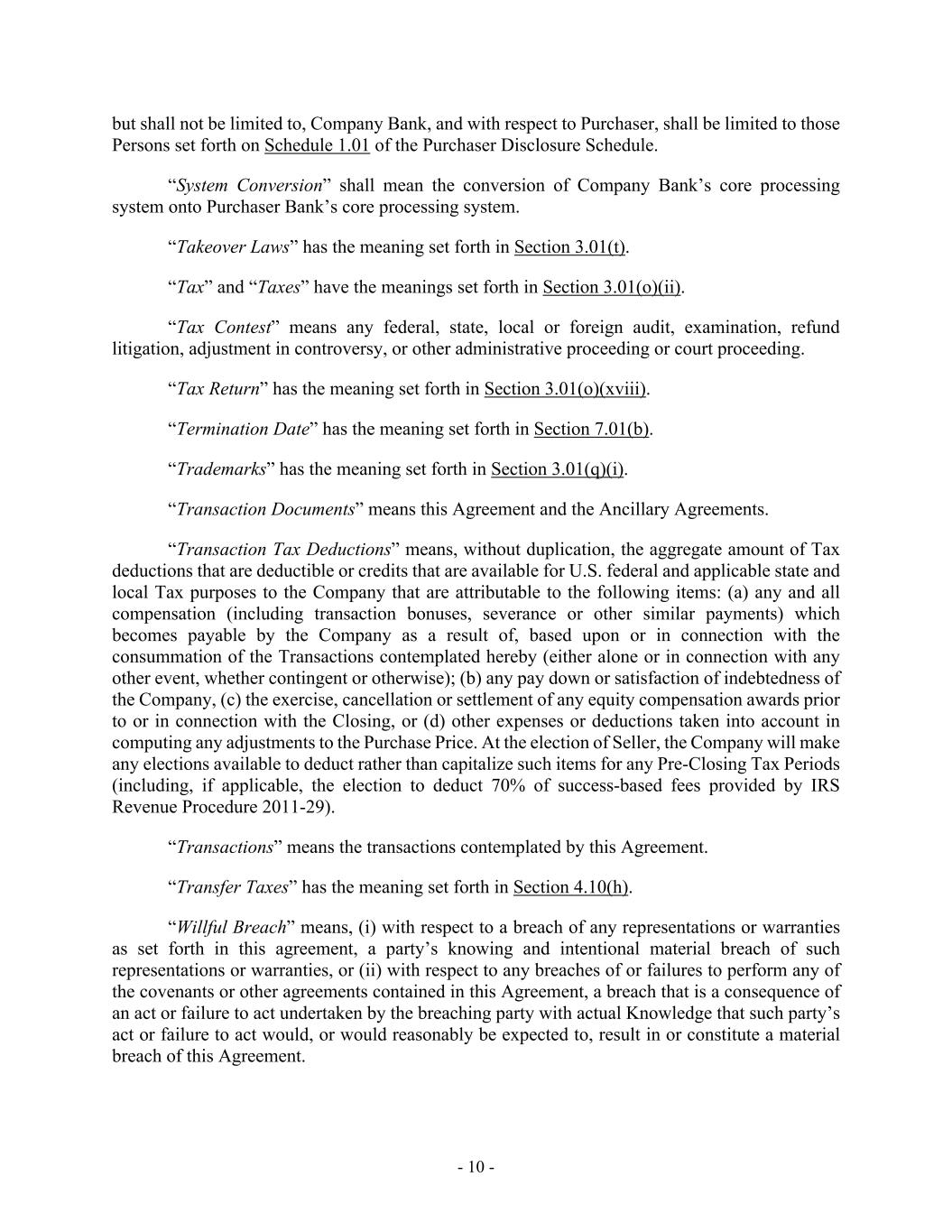 -10-但不限于公司银行,就买方而言,应限于买方披露附表附表1.01所列人员。“系统转换”是指将公司银行的核心处理系统转换为买方银行的核心处理系统。“收购法”具有第3.01(t)节规定的含义。“税”和“税”具有第3.01(o)(ii)节中规定的含义。“税务竞赛”是指任何联邦、州、地方或外国的审计、审查、退款诉讼、争议中的调整,或其他行政程序或法院程序。“纳税申报表”具有第3.01(o)(xviii)节中规定的含义。“终止日期”具有第7.01(b)节规定的含义。“商标”具有第3.01(q)(i)节规定的含义。“交易文件”是指本协议及附属协议。“交易税收减免”是指,在没有重复的情况下,可用于美国联邦和适用的州和地方税收目的的税收减免或抵免额的总额可归属于以下项目的公司:(a)公司因、基于或与本协议所设想的交易的完成(单独或与任何其他事件有关)而应支付的任何和所有补偿(包括交易奖金、遣散费或其他类似付款),(b)公司的任何首付或清偿债务,(c)在交割前或与交割有关的任何股权补偿奖励的行使、取消或结算,或(d)在计算对购买价格的任何调整时考虑到的其他费用或扣除。在卖方的选举中,公司将作出任何可用于扣除而不是将这些项目资本化的任何收盘前税期(包括,如适用,选择扣除IRS Revenue Procedure 2011-29提供的基于成功的费用的70%)的选择。“交易”是指本协议拟进行的交易。“转让税”具有第4.10(h)节规定的含义。“故意违约”是指,(i)就违反本协议中规定的任何陈述或保证而言,一方明知并故意实质性违反此类陈述或保证,或(ii)就任何违反或未能履行本协议所载的任何契诺或其他协议而言,由于违约方在实际知悉该方的作为或不作为将会或将合理预期会采取行动的情况下所采取的作为或不作为的结果而导致的违约,导致或构成对本协议的重大违反。