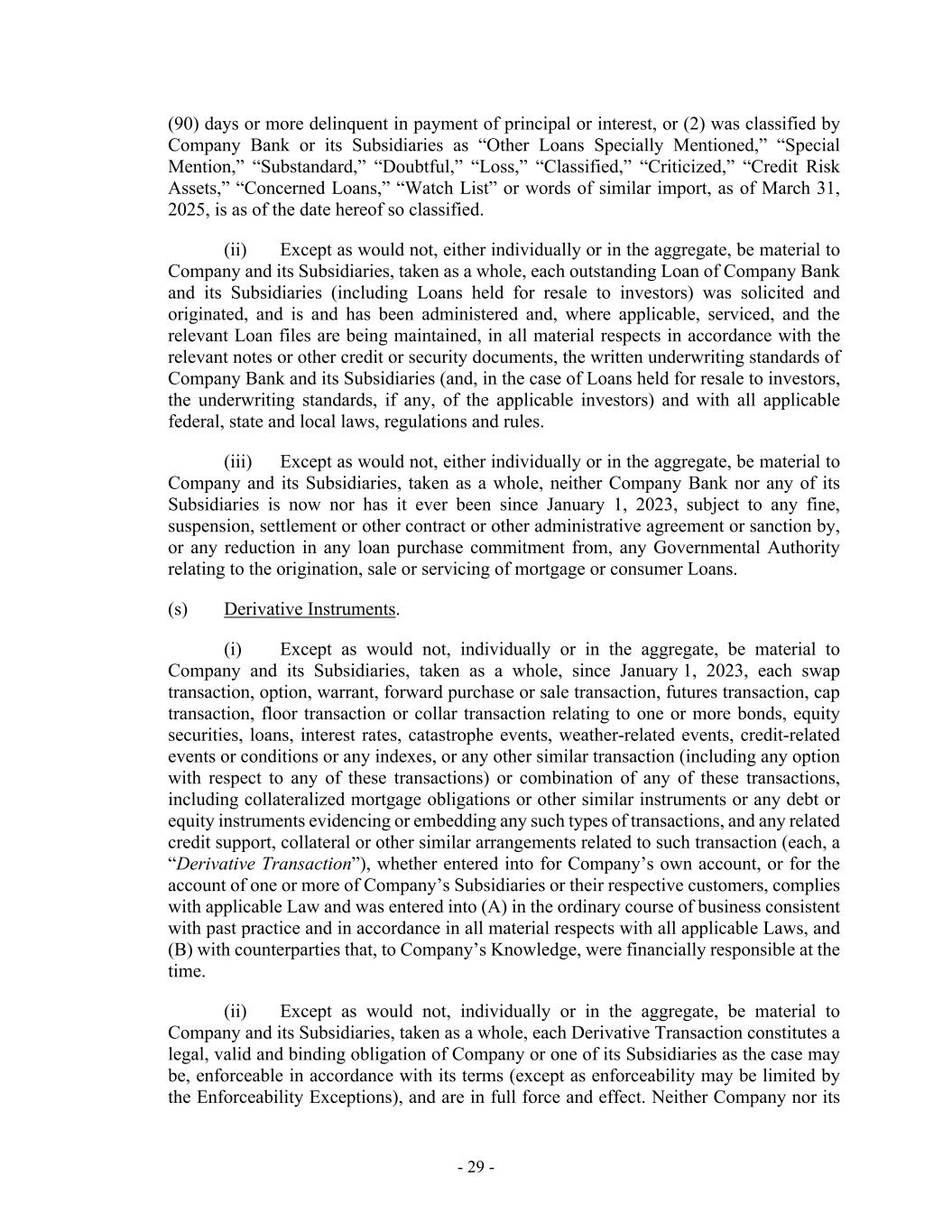 -29-(90)天或以上拖欠支付本金或利息,或(2)被公司银行或其子公司归类为“特别提及的其他贷款”、“特别提及”、“次级”、“可疑”、“损失”、“分类”、“批评”、“信用风险资产”、“关注贷款”、“观察名单”或类似重要性的词语,截至2025年3月31日,为截至本文件如此分类之日。(ii)公司银行及其附属公司的每笔未偿还贷款(包括为向投资者转售而持有的贷款),除个别或整体而言对公司及其附属公司不具有重大意义外,作为一个整体,公司银行及其附属公司的每笔未偿还贷款(包括为向投资者转售而持有的贷款)均是根据有关票据或其他信贷或担保文件在所有重大方面进行管理和(如适用)服务,并正在维护相关贷款档案,公司银行及其附属公司的书面承销标准(以及就为向投资者转售而持有的贷款而言,适用投资者的承销标准(如有),并符合所有适用的联邦、州和地方法律、法规和规则。(iii)除个别或整体而言对公司及其附属公司并不重要外,自2023年1月1日以来,公司银行或其任何附属公司现在或从来没有受到任何与抵押贷款或消费者贷款的发起、销售或服务有关的政府当局的任何罚款、暂停、结算或其他合同或其他行政协议或制裁,或任何减少任何贷款购买承诺。(s)衍生工具。(i)自2023年1月1日起,每项掉期交易、期权、认股权证、远期买入或卖出交易、期货交易、上限交易、下限交易或项圈交易(与一种或多种债券、股本证券、贷款、利率、灾难事件、与天气有关的事件、与信贷有关的事件或条件或任何指数有关)或任何其他类似交易(包括与任何这些交易有关的任何期权)或任何这些交易的组合,包括抵押抵押债务或其他类似工具或证明或嵌入任何此类交易的任何债务或权益工具,以及与此类交易相关的任何相关信贷支持、抵押品或其他类似安排(每一项,“衍生交易”),无论是为公司自己的账户,还是为公司的一个或多个子公司或其各自客户的账户订立,均符合适用法律,并在(a)与过去惯例一致的正常业务过程中并根据所有适用法律的所有重大方面订立,以及(b)与交易对手订立,据公司所知,当时负有财务责任。(ii)除个别或整体而言对公司及其附属公司并不重要外,作为一个整体,每项衍生交易均构成公司或其附属公司(视情况而定)的一项法律、有效及具约束力的义务,可根据其条款强制执行(除非可执行性可能受到可执行性例外情况的限制),并具有充分的效力和效力。公司或其
