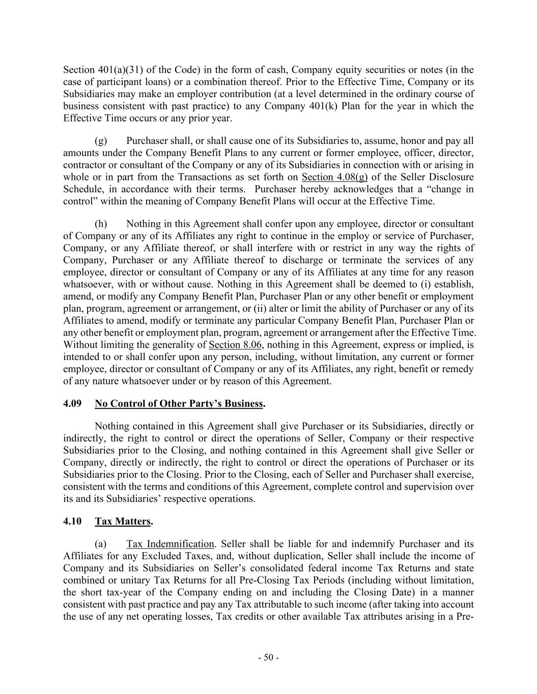 -50-《守则》第401(a)(31)条)以现金、公司股本证券或票据(在参与人贷款的情况下)或其组合的形式。在生效时间之前,公司或其子公司可向任何公司401(k)计划就生效时间发生的年度或任何前一年作出雇主供款(按与以往惯例一致的正常业务过程中确定的水平)。(g)买方须或须促使其附属公司之一根据卖方披露附表第4.08(g)条所列交易承担、兑现及支付公司或其任何附属公司的任何现任或前任雇员、高级人员、董事、承包商或顾问根据其条款承担、兑现及支付公司福利计划项下的所有款项,或全部或部分由该等交易产生。买方在此确认,公司利益计划所指的“控制权变更”将在生效时间发生。(h)本协议不得授予公司或其任何附属公司的任何雇员、董事或顾问任何继续雇用或服务买方、公司或其任何附属公司的权利,或以任何方式干预或限制公司、买方或其任何附属公司在任何时间以任何理由解除或终止公司或其任何附属公司的任何雇员、董事或顾问的服务的权利,无论是否有因由。本协议不得视为(i)建立、修订或修改任何公司福利计划、买方计划或任何其他福利或雇佣计划、计划、协议或安排,或(ii)更改或限制买方或其任何关联公司在生效时间后修改、修改或终止任何特定公司福利计划、买方计划或任何其他福利或雇佣计划、计划、协议或安排的能力。在不限制第8.06条的一般性的情况下,本协议中的任何明示或暗示的内容,均无意或应授予任何人,包括但不限于公司或其任何关联公司的任何现任或前任雇员、董事或顾问,根据本协议或因本协议而具有任何性质的任何权利、利益或补救措施。4.09不得控制他人业务。本协议中的任何内容均不得直接或间接给予买方或其子公司在交割前控制或指导卖方、公司或其各自子公司运营的权利,本协议中的任何内容均不得直接或间接给予卖方或公司在交割前控制或指导买方或其子公司运营的权利。交割前,卖方和买方各自应根据本协议的条款和条件,对其及其子公司的各自运营行使完全的控制权和监督权。4.10税务事项。(a)税务赔偿。卖方应对任何不包括的税款承担责任并赔偿买方及其关联公司,并且在不重复的情况下,卖方应以符合以往惯例的方式将公司及其子公司的收入包括在卖方的合并联邦所得税申报表和所有收盘前纳税期间(包括但不限于公司截止日期(包括收盘日期)的较短纳税年度)的州合并或单一纳税申报表中,并支付与该收入相关的任何税款(在考虑使用任何净经营亏损后,税收抵免或其他可用的税收属性产生于预-