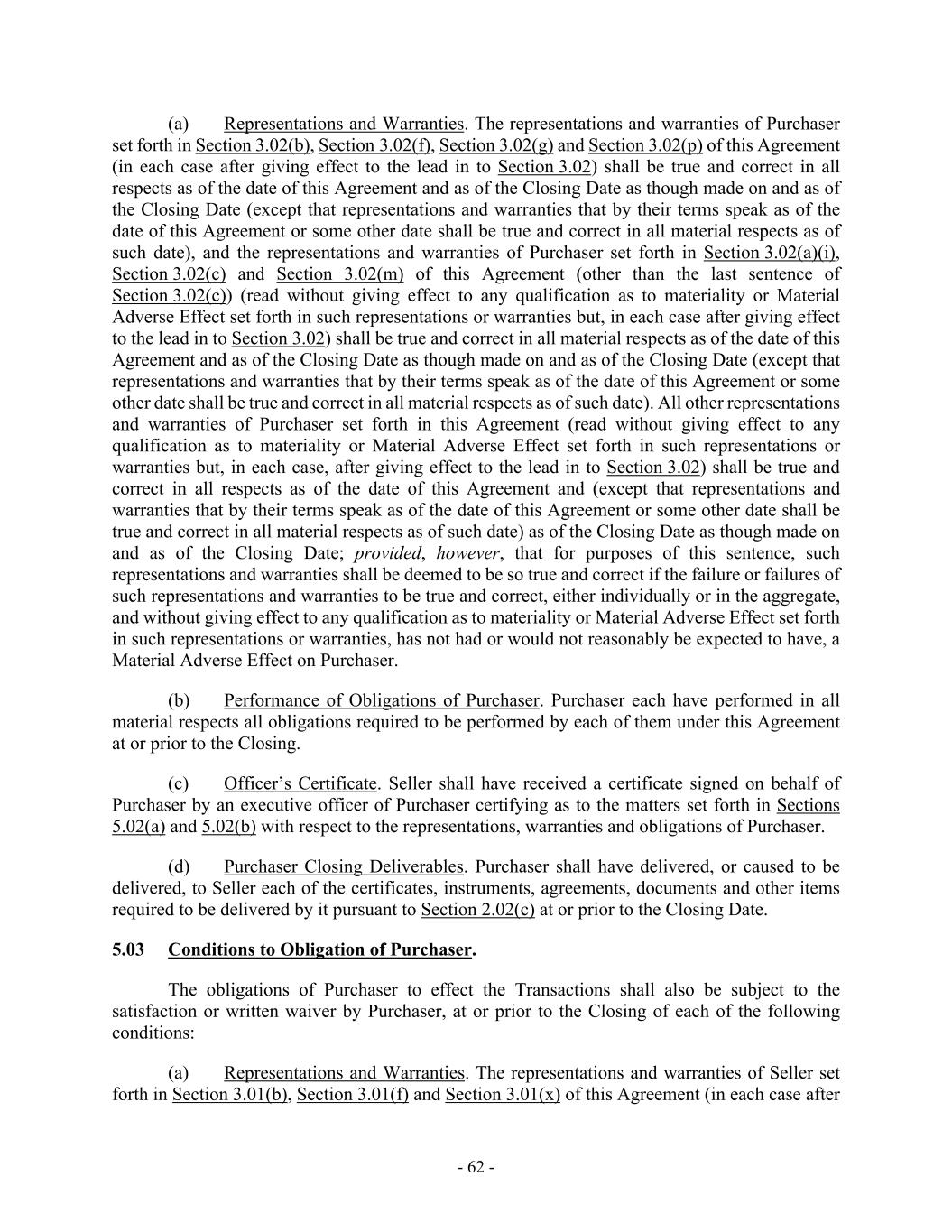 -62-(a)陈述和保证。第3.02(b)节、第3.02(f)节所载买方的申述及保证,本协议第3.02(g)节和第3.02(p)节(在每种情况下均在第3.02节的引线生效后)在所有方面均应是真实和正确的,截至本协议日期和截止日期,犹如在截止日期和截止日期作出的一样(但按其条款所说的截至本协议日期或某些其他日期的陈述和保证在截至该日期的所有重大方面均应是真实和正确的除外),以及第3.02(a)(i)节中规定的买方的陈述和保证,本协议第3.02(c)节和第3.02(m)节(第3.02(c)节最后一句除外)(解读时不考虑此类陈述或保证中所述的关于重要性或重大不利影响的任何限定,但,在每种情况下,在第3.02条的引线生效后),截至本协议日期和截止日期,在所有重大方面均应真实和正确,犹如在截止日期和截止日期作出的一样(但根据其条款在本协议日期或某些其他日期所述的陈述和保证,在截至该日期的所有重大方面均应真实和正确)。本协议中规定的买方的所有其他陈述和保证(理解为不影响此类陈述或保证中规定的关于重要性或重大不利影响的任何限定条件,但在每种情况下,在第3.02条的引线生效后)应在本协议日期的所有方面都是真实和正确的,并且(除非根据其条款在本协议日期或某些其他日期所述的陈述和保证在该日期的所有重要方面都是真实和正确的)截至截止日期,如同在截止日期和截止日期作出的一样;但是,就本句而言,如果此类陈述和保证的失败或失败是真实和正确的,无论是单独的还是总体的,并且没有使此类陈述或保证中所述的关于重要性或重大不利影响的任何限定生效,则此类陈述和保证应被视为如此真实和正确,没有或不会合理地预期会对买方产生重大不利影响。(b)履行买方的义务。买方各自已在所有重大方面履行了各自在交割时或交割前根据本协议要求履行的所有义务。(c)人员证明书。卖方应已收到一份由买方执行官员代表买方签署的证明,证明第5.02(a)和5.02(b)条所述有关买方的陈述、保证和义务的事项。(d)买方结清交付品。买方应已在截止日期或之前向卖方交付或安排交付其根据第2.02(c)节要求交付的每一份证书、文书、协议、文件和其他物品。5.03买方义务的条件。买方实现交易的义务还应以买方在以下每一项条件结束时或之前达成或书面放弃为前提:(a)陈述和保证。本协议第3.01(b)节、第3.01(f)节和第3.01(x)节中规定的卖方的陈述和保证(在每种情况下都是在