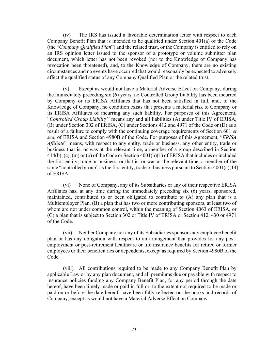 -23-(iv)IRS已就拟根据《守则》第401(a)条获得资格的每个公司福利计划(“公司合格计划”)和相关信托发出有利的确定函,或公司有权依赖IRS向原型或批量提交计划文件的保荐人发出的意见函,该信函未被撤销(也未向公司知悉已被威胁撤销),并且,据公司所知,不存在合理预期会对任何公司合格计划或相关信托的合格状态产生不利影响的现有情况和未发生的事件。(v)除不会对公司产生重大不利影响外,在紧接前六(6)年期间,公司或其ERISA关联公司未发生未完全满足的受控集团责任,并且据公司所知,不存在对公司或其ERISA关联公司产生任何此类责任的重大风险的条件。就本协议而言,“受控集团责任”是指ERISA第四章下的任何和所有责任(a)、ERISA第302条下的(b)、《守则》第412和4971条下的(c)或由于未能遵守ERISA第601节及其后各节和《守则》第4980B节的持续覆盖要求而导致的(d)。就本协议而言,“ERISA关联公司”是指,就任何实体、贸易或业务而言,任何其他实体、贸易或业务是或在相关时间是《守则》第414(b)、(c)、(m)或(o)节或ERISA第4001(b)(1)节中描述的包括或包括第一个实体、贸易或业务的集团的成员,或在相关时间是或曾经是根据ERISA第4001(a)(14)节与第一个实体、贸易或业务的同一“受控集团”的成员。(vi)公司、其任何附属公司或其各自的任何ERISA关联公司均未在紧接前六(6)年的任何时间为(a)属于多雇主计划的任何计划提供担保、维持、提供或有义务提供担保,(b)有两个或更多提供担保的发起人的计划,其中至少两个发起人不受ERISA第4063条所指的共同控制,或(c)受ERISA第302条或标题IV或《守则》第412、430或4971条规限的计划。(vii)除《守则》第4980B条规定外,公司或其任何附属公司均不赞助任何雇员福利计划,亦不就为退休或前雇员或其受益人或受抚养人提供任何离职后或退休后医疗或人寿保险福利的安排承担任何义务。(viii)根据适用法律或任何计划文件规定须向任何公司福利计划作出的所有供款,以及就资助任何公司福利计划的保险单而在截至本协议日期的任何期间内到期或应付的所有保费,均已及时作出或全额支付,或在本协议日期或之前并无规定作出或支付的范围内,已在公司的簿册和记录上充分反映,但不会对公司产生重大不利影响的除外。