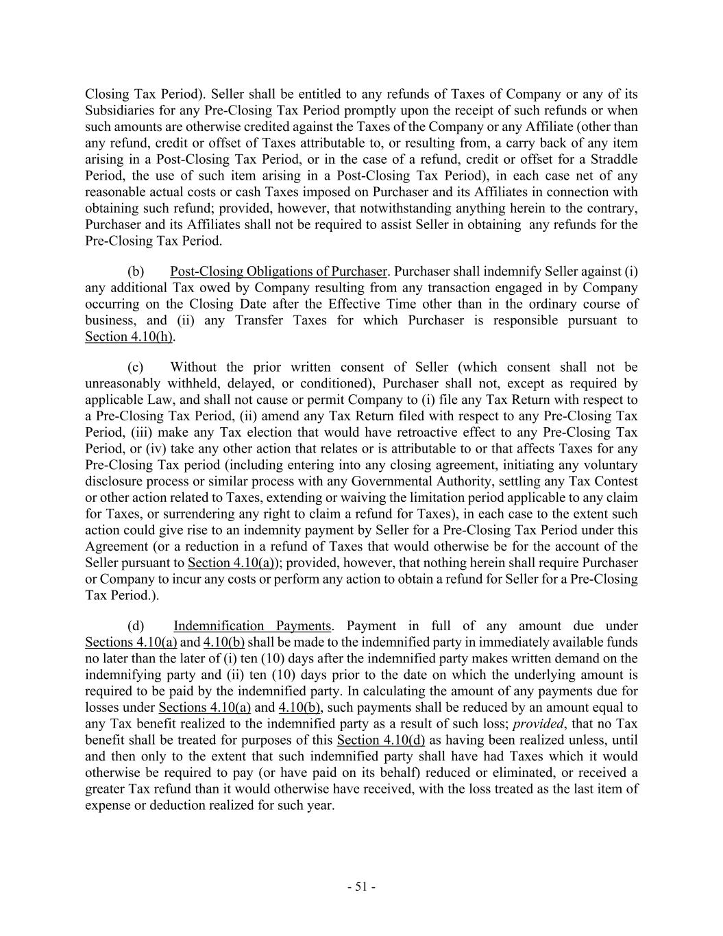 -51-结税期间)。卖方有权在收到公司或其任何子公司的任何收盘前税期的任何税款退款后立即或当这些金额以其他方式记入公司或任何关联公司的税款的贷项(不包括在收盘后税期内产生的任何项目的结转应占或产生的税款的任何退款、贷项或抵销,或在退还、贷项或抵销跨座期的情况下,在收盘后税期内产生的该项目的使用),在每一种情况下,扣除因获得此类退款而对买方及其关联公司征收的任何合理的实际成本或现金税;但前提是,尽管本文有任何相反的规定,买方及其关联公司不应被要求协助卖方获得收盘前纳税期的任何退款。(b)买方的交割后义务。买方应就(i)公司在生效时间后的截止日期所从事的任何交易所产生的公司所欠的任何额外税款(在正常业务过程中除外)向卖方作出赔偿,以及(ii)买方根据第4.10(h)条负责的任何转让税。(c)未经卖方事先书面同意(同意不得被无理扣留、延迟或附加条件),除适用法律要求外,买方不得且不得促使或允许公司(i)就某一截止前税期提交任何纳税申报表,(ii)修订就任何截止前税期提交的任何纳税申报表,(iii)作出任何将追溯任何截止前税期的税务选择,(iv)就任何结束前的税期采取任何与或可归因于或影响税项的其他行动(包括订立任何结束协议、与任何政府当局启动任何自愿披露程序或类似程序、解决任何税务争议或其他与税项有关的行动、延长或放弃适用于任何税项申索的时效期限,或放弃任何要求退税的权利),在每种情况下,只要此类行动可能导致卖方支付本协议下的交割前税期的赔偿金(或减少根据第4.10(a)节应由卖方承担的税款退款);但本协议中的任何内容均不得要求买方或公司承担任何费用或采取任何行动为卖方获得交割前税期的退款。)。(d)赔偿款项。根据第4.10(a)及4.10(b)条到期的任何款项,须不迟于获弥偿方向弥偿方提出书面要求后(i)十(10)天及(ii)要求获弥偿方支付相关款项的日期前十(10)天,以即时可用资金向获弥偿方全额支付。在计算根据第4.10(a)和4.10(b)条应就损失支付的任何款项的数额时,该等款项须减少相当于因该损失而向获弥偿方实现的任何税务利益的数额;但就本条而言,不得将任何税务利益视为已实现,除非在此之前仅在该获弥偿方已有其本应被要求支付(或已代其支付)的税款减少或消除的范围内,或获得比原本应获得的更多的退税,损失被视为该年度实现的最后一项费用或扣除。