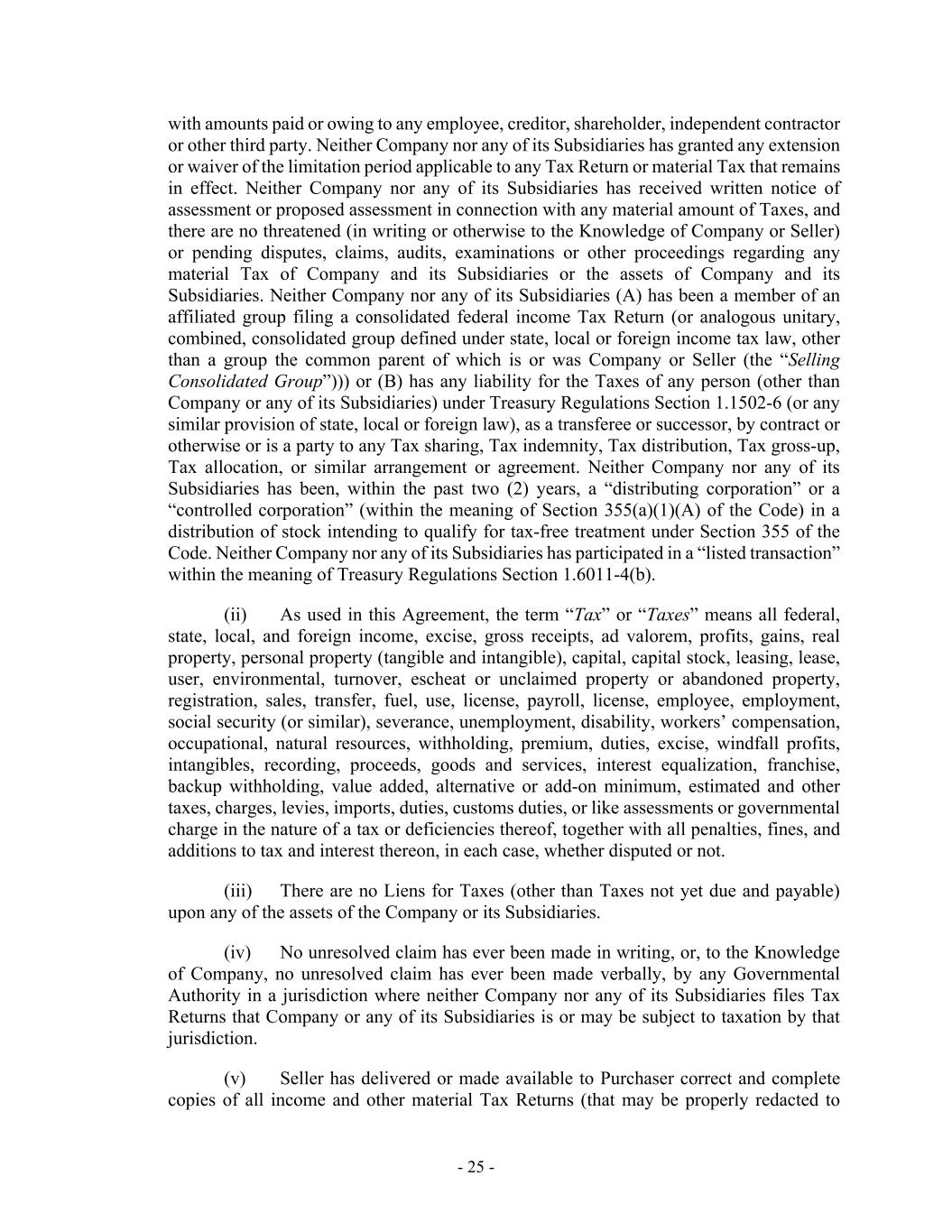 -25-已支付或欠任何雇员、债权人、股东、独立承包商或其他第三方的款项。本公司或其任何附属公司均未批准任何延长或豁免适用于任何仍然有效的报税或物资税的时效期间。公司或其任何附属公司均未收到与任何重大税额有关的书面评估通知或拟议评估,并且没有威胁(公司或卖方知悉的书面或其他形式)或有关公司及其附属公司或公司及其附属公司的资产的任何重大税项的未决争议、索赔、审计、审查或其他程序。公司或其任何子公司(a)均不是提交合并联邦所得税申报表的关联集团(或根据州、地方或外国所得税法定义的类似单一、合并、合并集团,但其共同母公司是或曾经是公司或卖方的集团(“出售合并集团”)除外)的成员,或(b)对作为受让人或继承人的任何人(公司或其任何子公司除外)根据财政部条例第1.1502-6条(或州、地方或外国法律的任何类似规定)的税收承担任何责任,通过合同或其他方式或是任何税收分享、税收赔偿、税收分配、税收总额、税收分配或类似安排或协议的一方。在过去两(2)年内,公司或其任何附属公司均不是“分销公司”或“受控公司”(在《守则》第355(a)(1)(a)条的含义内)在有意符合《守则》第355条规定的免税待遇的股票分销中。公司或其任何子公司均未参与《财务条例》第1.6011-4(b)节所指的“上市交易”。(二)本协议所称“税”或“税”是指所有联邦、州、地方和外国收入、消费税、毛收入、从价、利润、收益、不动产、个人财产(有形和无形)、资本、股本、租赁、租赁、用户、环境、周转、无人认领或无人认领的财产或废弃财产、登记、销售、转让、燃料、使用、许可证、工资、许可证、雇员、就业、社会保障(或类似)、遣散费、失业、残疾、工人赔偿、职业、自然资源、代扣代缴、溢价、关税、消费税、意外利润、无形资产、记录、收益、货物和服务、利息均衡、特许经营、备用代扣代缴、增值、替代或附加最低、估计和其他税、收费,征税、进口、关税、关税或类似评估或政府收费的税收性质或其缺陷,连同所有处罚、罚款,以及对税收和利息的附加,在每种情况下,无论是否有争议。(iii)公司或其附属公司的任何资产并无留置税(尚未到期及应付的税项除外)。(iv)在公司或其任何附属公司均未提交公司或其任何附属公司正在或可能须受该司法管辖区课税的税务申报表的司法管辖区内,任何政府当局从未以书面提出任何未解决的申索,或据公司所知,从未以口头提出任何未解决的申索。(v)卖方已向买方交付或提供所有收入和其他重要纳税申报表的正确完整副本(可适当编辑至