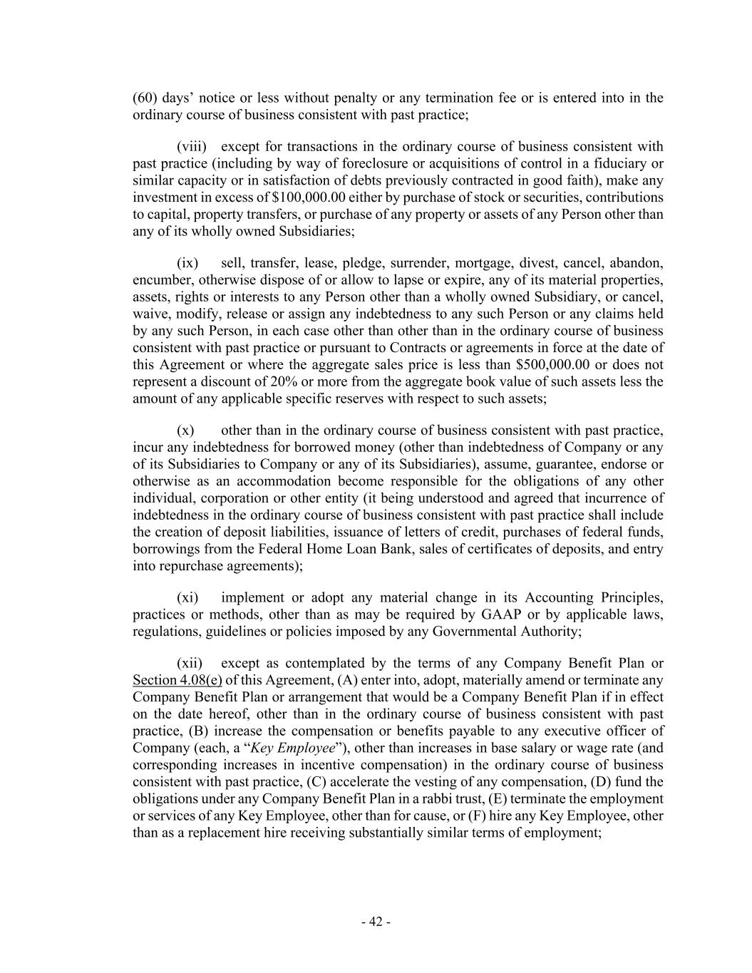 -提前42-(60)天或更短时间通知,不收取任何罚款或任何终止费,或在符合以往惯例的正常业务过程中订立;(viii)除与以往惯例一致的正常业务过程中的交易(包括通过以受托人或类似身份取消抵押品赎回权或获得控制权的方式,或通过购买股票或证券、出资、财产转让等方式清偿先前善意订立的债务)外,进行任何超过100,000.00美元的投资,或购买除其任何全资附属公司以外的任何人的任何财产或资产;(ix)将其任何重要财产、资产、权利或权益出售、转让、出租、质押、交出、抵押、剥离、注销、放弃、设保、以其他方式处置或允许失效或到期,或取消、放弃、修改、解除或转让任何该等人的任何债务或任何该等人持有的任何债权,在每种情况下,除非是在符合以往惯例的正常业务过程中或根据在本协议日期有效的合同或协议,或总销售价格低于500,000.00美元或不代表此类资产的总账面值减去与此类资产有关的任何适用特定储备金金额的20%或更多的折扣;(x)除非在符合以往惯例的正常业务过程中,因所借款项而产生任何债务(公司或其任何附属公司对公司或其任何附属公司的债务除外),承担、担保、背书或以其他作为通融的方式变得对任何其他个人、公司或其他实体的义务负责(据了解并同意,在与以往惯例一致的正常业务过程中产生债务,应包括创设存款负债、开具信用证、购买联邦基金、从联邦Home Loan银行借款、出售存款证明,及订立回购协议);(xi)实施或采纳其会计原则、惯例或方法的任何重大变更,但公认会计原则或任何政府当局施加的适用法律、条例、指引或政策可能要求的除外;(xii)除非任何公司福利计划的条款或本协议第4.08(e)节所设想的,(a)订立、采纳、实质修订或终止任何公司福利计划或安排,而该计划或安排如于本协议日期生效,则属公司福利计划,但在与以往惯例一致的正常业务过程中除外,(b)增加应付公司任何行政人员(每个人,一个“关键雇员”)的薪酬或福利,但在与以往惯例一致的正常业务过程中增加基本工资或工资率(以及相应增加奖励薪酬)除外,(c)加速归属任何薪酬,(d)在拉比信托中为任何公司福利计划下的义务提供资金,(e)终止任何关键雇员的雇用或服务(因故除外),或(f)雇用任何关键雇员,但作为接受基本相似雇用条款的替代雇员除外;
