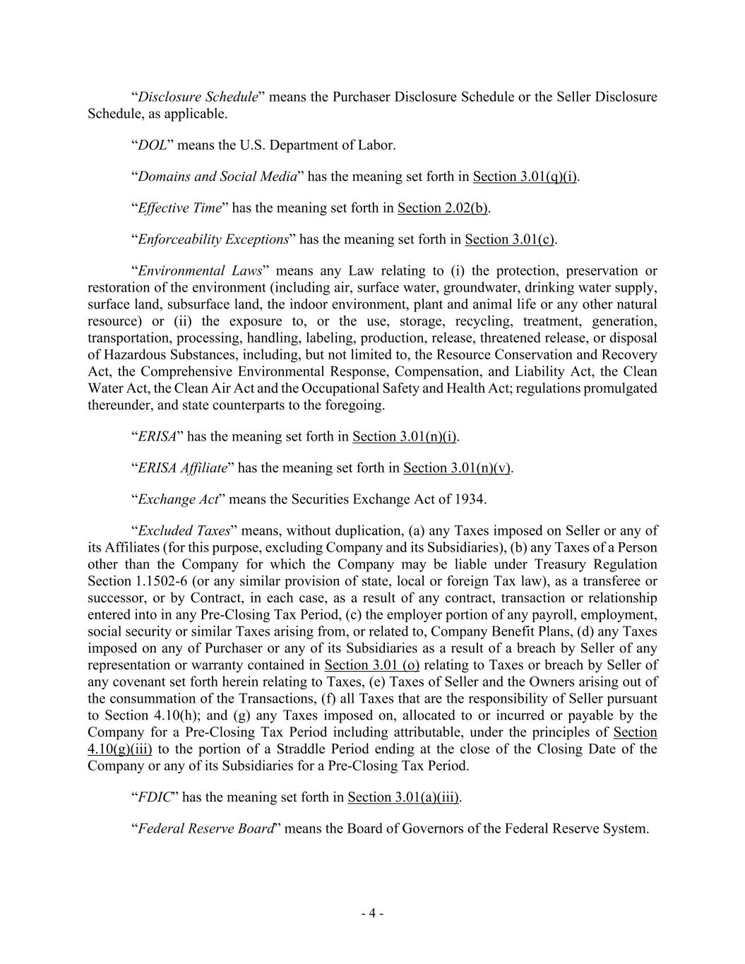 -4-“披露时间表”指买方披露时间表或卖方披露时间表(如适用)。“DOL”意为美国劳工部。“域名和社交媒体”具有第3.01(q)(i)节中规定的含义。“生效时间”具有第2.02(b)节规定的含义。“可执行性例外”具有第3.01(c)节规定的含义。“环境法”是指与(i)保护、保存或恢复环境(包括空气、地表水、地下水、饮用水供应、地表土地、地下土地、室内环境、动植物生命或任何其他自然资源)或(ii)接触或使用、储存、回收、处理、生成、运输、加工、处理、标签、生产、释放、威胁释放或处置有害物质有关的任何法律,包括但不限于《资源保护和恢复法》、《综合环境应对、赔偿和责任法》、《清洁水法》,《清洁空气法》和《职业安全与健康法》;据此颁布的条例,以及与上述规定相对应的国家。“ERISA”具有第3.01(n)(i)节规定的含义。“ERISA Affiliate”具有第3.01(n)(v)节中规定的含义。“交易法”是指1934年的《证券交易法》。“排除税项”是指(a)对卖方或其任何关联公司(为此目的,不包括公司及其子公司)征收的任何税款,(b)公司以外的人作为受让人或继承人作为公司根据财政部条例第1.1502-6条(或州、地方或外国税法的任何类似规定)可能负有责任的任何税款,或通过合同,在每种情况下,由于在任何交割前税期内订立的任何合同、交易或关系,(c)任何工资单、就业的雇主部分,因公司福利计划而产生或与之相关的社会保障或类似税收,(d)因卖方违反第3.01(o)节所载与税收有关的任何陈述或保证而对买方或其任何子公司征收的任何税收,或卖方违反本协议所载与税收有关的任何契诺,(e)因交易的完成而产生的卖方和所有者的税收,(f)根据第4.10(h)节由卖方负责的所有税收;(g)对任何征收的税收,根据第4.10(g)(iii)条的原则,分配给公司或由公司招致或应付的一个收盘前税期,包括归属于在公司或其任何子公司的一个收盘前税期的收盘日期结束时结束的跨座期部分。“FDIC”具有第3.01(a)(iii)节中规定的含义。“联邦储备委员会”是指联邦储备系统的理事会。