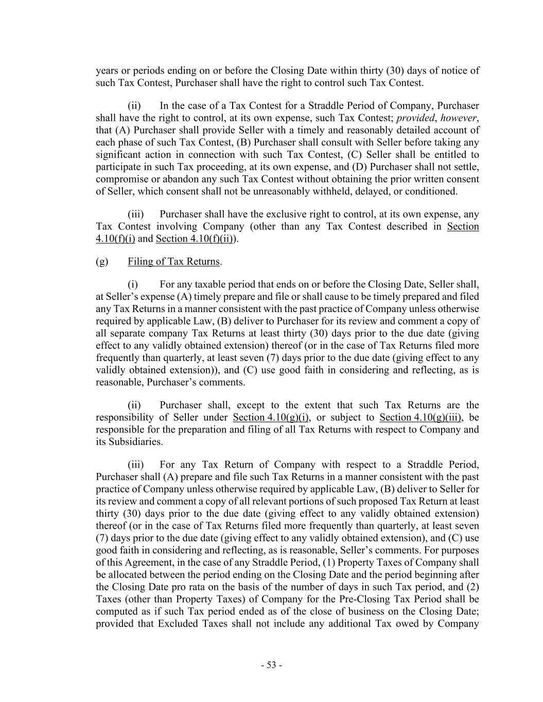 -53年-在该税务竞赛通知三十(30)天内的截止日期或之前结束的期间,买方有权控制该税务竞赛。(ii)在公司跨期税务竞赛的情况下,买方有权自费控制该税务竞赛;但条件是(a)买方应向卖方提供该税务竞赛每一阶段的及时和合理的详细账目,(b)买方在就该税务竞赛采取任何重大行动之前应与卖方协商,(c)卖方有权参加该税务程序,费用自理,以及(d)买方不得结算,在未获得卖方事先书面同意的情况下妥协或放弃任何此类税务竞赛,该同意不得被无理拒绝、延迟或附加条件。(iii)买方拥有自费控制涉及公司的任何税务竞赛(第4.10(f)(i)条及第4.10(f)(ii)条所述的任何税务竞赛除外)的专属权利。(g)提交纳税申报表。(i)对于截止日期或之前结束的任何应课税期,卖方应(a)按符合公司以往惯例的方式及时编制和归档或应促使及时编制和归档任何纳税申报表,除非适用法律另有规定,(b)在其到期日期(使任何有效获得的延期生效)至少三十(30)天前(或在提交的纳税申报表比季度更频繁的情况下)向买方交付所有单独的公司纳税申报表的副本供其审查和评论,费用由卖方承担,至少在到期日期前七(7)天(使任何有效获得的延期生效)),以及(c)在合理情况下本着诚意考虑和反映买方的评论。(ii)除根据第4.10(g)(i)条或在符合第4.10(g)(iii)条的规定下,该等报税表由卖方负责外,买方须负责编制及提交有关公司及其附属公司的所有报税表。(iii)就公司任何有关跨座期的报税表而言,买方须(a)除非适用法律另有规定,否则须以符合公司以往惯例的方式编制及提交该等报税表,(b)在该等建议的报税表的到期日期(使任何有效取得的延期生效)至少三十(30)天前(或如报税表提交的次数多于季度,则须向卖方交付该等建议的报税表的所有有关部分的副本,以供其覆核及评论,至少在到期日前七(7)天(使任何有效获得的延期生效),以及(c)在合理的情况下本着诚意考虑和反映卖方的评论。就本协议而言,在任何跨期的情况下,(1)公司的物业税应在截止日期结束的期间和截止日期后开始的期间之间根据该税期的天数按比例分配,以及(2)公司在截止日期前的税期的税项(物业税除外)应计算,犹如该税期在截止日期营业结束时结束一样;但不包括的税项不包括公司所欠的任何额外税款