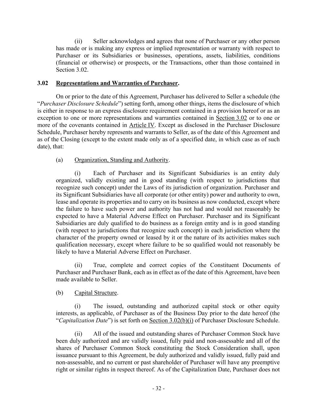 -32-(ii)卖方承认并同意,买方或任何其他人均未就买方或其子公司或业务、运营、资产、负债、条件(财务或其他)或前景或交易作出或正在作出任何明示或暗示的陈述或保证,但第3.02节所载的那些除外。3.02买方的陈述和保证。在本协议日期当日或之前,买方已向卖方交付一份附表(“买方披露附表”),其中载列(其中包括)披露的项目,这些项目要么是为了响应本协议条款中所载的明示披露要求,要么是作为第3.02节中所载的一项或多项陈述和保证的例外,或者是第四条中所载的一项或多项契诺的例外。除买方披露附表中披露的情况外,买方特此向卖方声明并保证,截至本协议日期和交割时(除非仅在特定日期作出,在这种情况下为该日期):(a)组织、地位和权威。(i)每一买方及其重要子公司都是根据其组织管辖权的法律适当组织、有效存在并具有良好信誉(就承认这一概念的法域而言)的实体。买方及其重要子公司拥有所有公司(或其他实体)权力和授权,以拥有、租赁和经营其财产,并按目前的方式开展其业务,除非未能拥有此类权力和授权并未产生也不会合理地预期会对买方产生重大不利影响。买方及其重要子公司具有作为外国实体开展业务的适当资格,并在其拥有或租赁的财产的性质或其活动的性质使此种资格成为必要的每个法域(就承认此种概念的法域而言)具有良好的信誉,除非不具备此种资格不会合理地可能对买方产生重大不利影响。(二)买方和买方银行组成文件的真实、完整和正确副本(自本协议之日起生效)已提供给卖方。(二)资本Structure。(i)买方截至本协议日期前一个营业日(“资本化日期”)的已发行、未偿还及认可股本或其他股本权益(如适用)载于买方披露附表第3.02(b)(i)节。(ii)买方普通股的所有已发行及未发行股份均已获正式授权并获有效发行、已缴足及不可评税,而构成股票代价的买方普通股的所有股份于依据本协议发行时,须获正式授权及有效发行、已缴足及不可评税,且买方的任何现任或过往股东均不会就此拥有任何优先购买权或类似权利。截至资本化日期,买方不