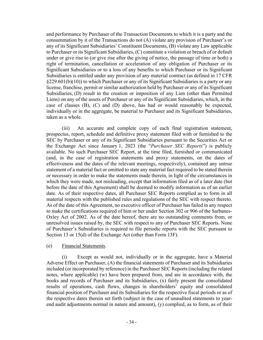 -34-且买方履行其作为一方当事人的交易文件并由其完成交易不(a)违反买方或其任何重要子公司的组成文件的任何规定,(b)违反适用于买方或其重要子公司的任何法律,(c)构成违反或违反或不遵守或导致(或在发出通知、时间流逝或两者兼而有之后产生)终止权,取消或加速履行买方或其重要子公司的任何义务,或丧失买方或其重要子公司根据买方或其任何重要子公司为一方的任何重要合同(定义见17 CFR § 229.601(b)(10))的任何条款或买方或其任何重要子公司持有的任何许可、特许、许可或类似授权有权享有的任何利益,(d)导致对买方或其任何重要子公司的任何资产产生或施加任何留置权(许可留置权除外),这,在上述(b)、(c)和(d)条的情况下,已经或将合理地预期,单独或合计,对买方及其重要子公司整体而言是重要的。(iii)买方或其任何重要子公司自2023年1月1日以来根据《证券法》或《交易法》向SEC提交或提供的每份最终注册声明、招股说明书、报告、时间表和最终代理声明的准确和完整副本(“买方SEC报告”)可公开获取。任何此类买方SEC报告,在提交、提供或传达时(以及,就登记声明和代理声明而言,分别在生效日期和相关会议日期),均不包含对重大事实的任何不真实陈述,或根据作出这些陈述的情况,未说明任何需要在其中陈述或为作出其中所作陈述而必要的重大事实,而不是误导,但在较晚日期(但在本协议日期之前)提交的信息应被视为修改了较早日期的信息。截至各自日期,所有买方SEC报告在所有重大方面均符合SEC已发布的相关规则和规定。截至本协议签署之日,买方的任何执行官员都没有在任何方面未能根据2002年《萨班斯-奥克斯利法案》第302或906条对他或她作出要求的证明。截至本报告发布之日,没有SEC就任何买方SEC报告提出的未决评论或未解决的问题。根据《交易法》第13或15(d)条(表格13F除外),买方的任何子公司均无需向SEC提交定期报告。(e)财务报表。(i)除个别或总体上不会对买方产生重大不利影响外,(a)买方SEC报告(包括相关附注,如适用)中包含(或以引用方式并入)的买方及其子公司的财务报表(w)是根据且符合买方及其子公司的账簿和记录编制的,(x)公允列报综合经营业绩、现金流量,买方及其子公司在各自会计期间或截至其中所列各自日期的股东权益变动和合并财务状况(在未经审计报表的情况下,须按性质和金额正常的年终审计调整),(y)就形式而言,截至其