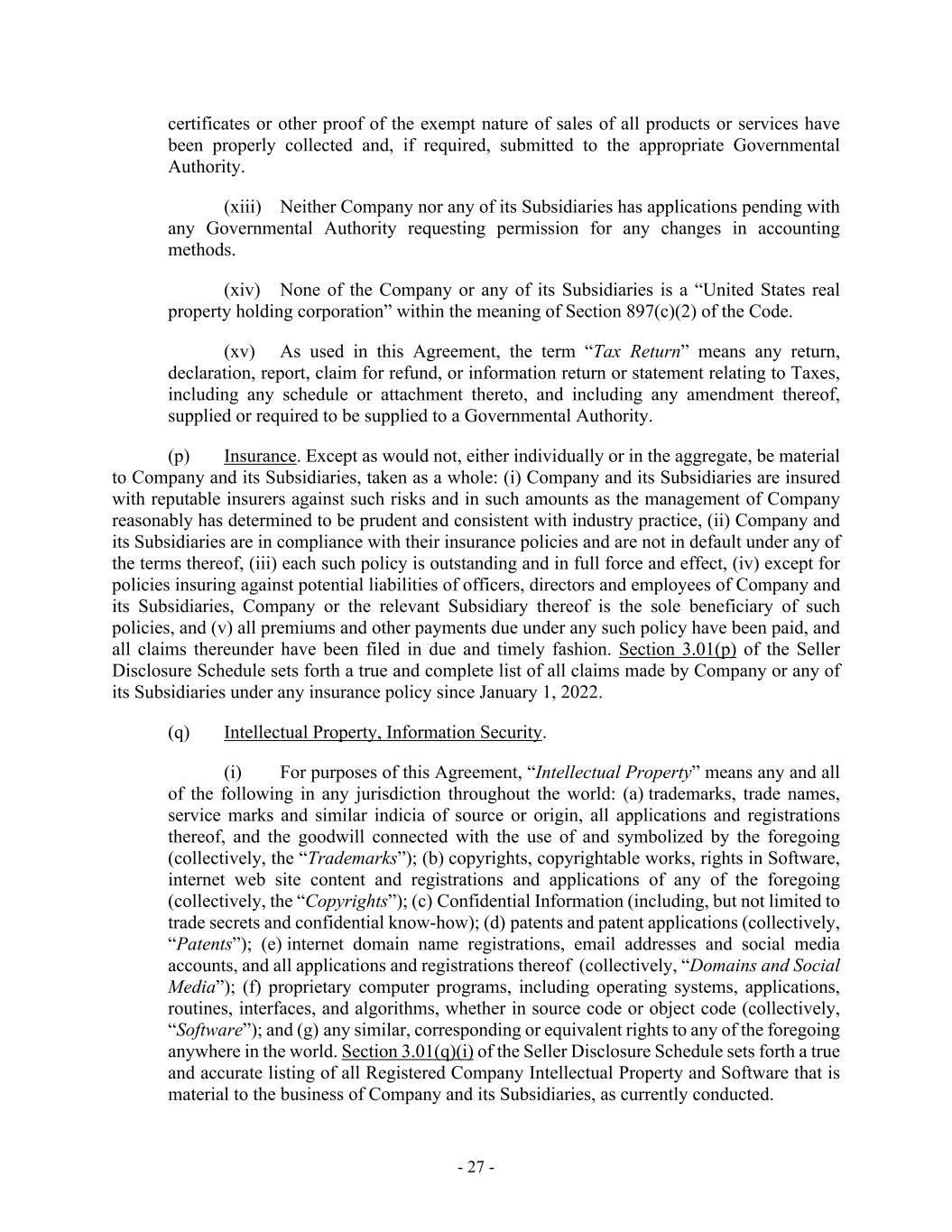 -27-所有产品或服务的销售豁免性质的证明或其他证明已得到适当收集,如有需要,已提交给适当的政府当局。(xiii)本公司或其任何附属公司均没有向任何政府当局提出申请以待处理,要求准许任何会计方法的变更。(xiv)本公司或其任何附属公司均不是《守则》第897(c)(2)条所指的“美国不动产控股公司”。(十五)如本协议所用,“纳税申报表”一词是指向政府当局提供或要求提供的任何纳税申报表、申报、报告、退款要求或与税收有关的信息申报表或报表,包括其任何附表或附件,并包括其任何修订。(p)保险。除个别或整体上不会对公司及其附属公司构成重大影响外,作为一个整体:(i)公司及其附属公司向信誉良好的保险人投保有关风险的保险,并按公司管理层合理地确定为审慎及符合行业惯例的金额投保,(ii)公司及其附属公司遵守其保单,且根据其任何条款均未发生违约,(iii)每份该等保单均未履行且完全有效,(iv)除为公司及其附属公司的高级职员、董事及雇员的潜在责任投保的保单外,公司或其有关附属公司是该等保单的唯一受益人,及(v)根据任何该等保单到期的所有保费及其他付款均已支付,且根据该等保单提出的所有索偿均已按适当及及时的方式提出。卖方披露附表第3.01(p)节列出了自2022年1月1日以来公司或其任何子公司根据任何保险单提出的所有索赔的真实完整清单。(q)知识产权、信息安全。(i)就本协议而言,“知识产权”是指在世界各地任何司法管辖区的任何及所有以下情况:(a)商标、商号、服务标记和来源或来源的类似标记、其所有申请和注册,以及与使用上述内容有关和由其象征的商誉(统称“商标”);(b)著作权、可受版权保护的作品、软件权利、互联网网站内容以及上述任何一项的注册和应用(统称“版权”);(c)机密信息(包括但不限于商业秘密和机密专有技术);(d)专利和专利申请(统称,“专利”);(e)互联网域名注册、电子邮件地址和社交媒体账户,及其所有应用程序和注册(统称“域名和社交媒体”);(f)专有计算机程序,包括操作系统、应用程序、例程、接口和算法,无论是在源代码还是对象代码中(统称“软件”);(g)在世界任何地方与上述任何一种类似、对应或等同的权利。卖方披露附表第3.01(q)(i)节列出了对公司及其子公司的业务具有重要意义的所有注册公司知识产权和软件的真实和准确的清单,如目前所进行的那样。