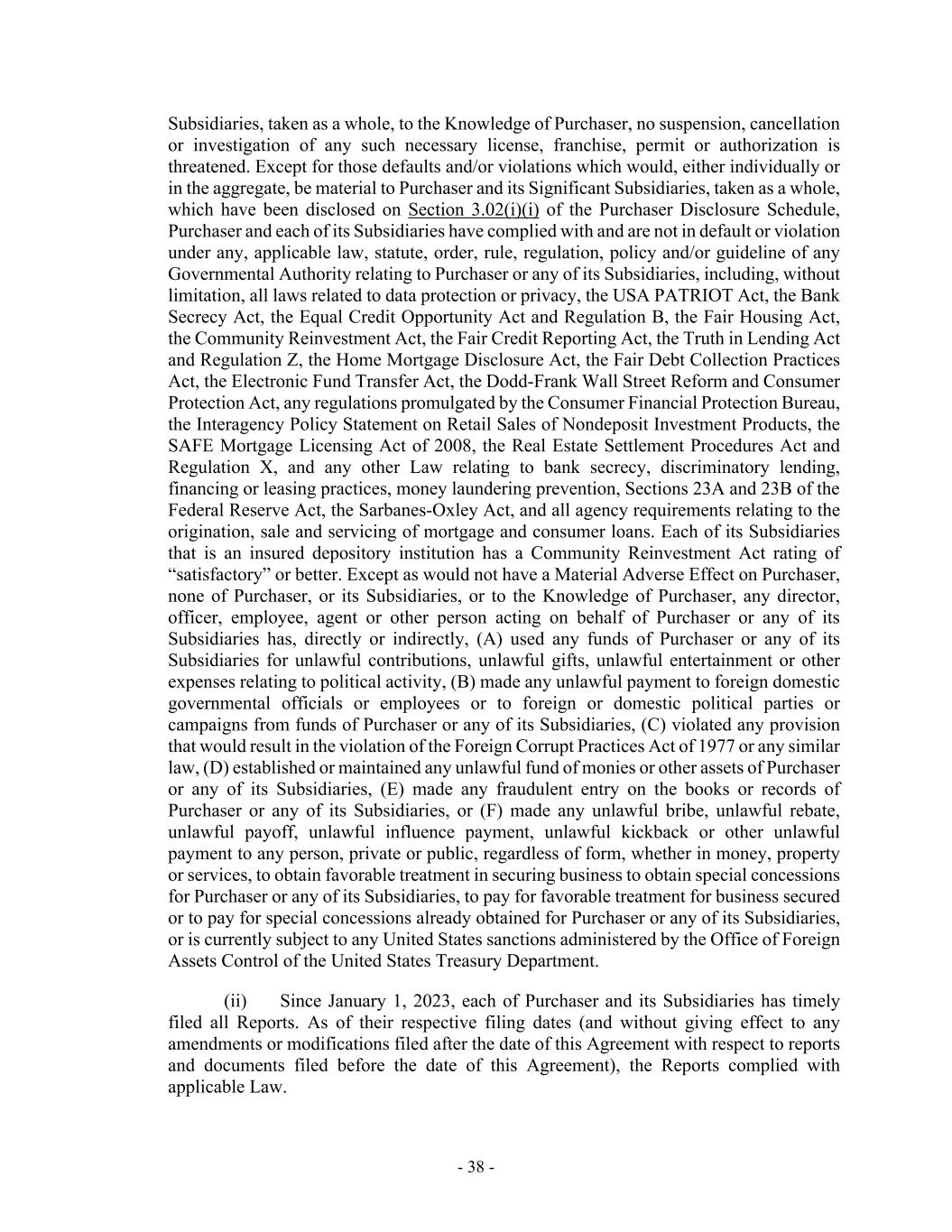 -38-子公司,作为一个整体,在买方知情的情况下,不会威胁暂停、取消或调查任何此类必要的许可、特许、许可或授权。除已根据《买方披露附表》第3.02(i)(i)节披露的个别或总体上对买方及其重要子公司构成重大影响的违约和/或违规行为外,买方及其每个子公司均已遵守且未违反任何与买方或其任何子公司有关的适用法律、法规、命令、规则、条例、政策和/或指南,包括但不限于与数据保护或隐私相关的所有法律、《美国爱国者法》、《银行保密法》,平等信贷机会法和条例B、公平住房法、社区再投资法、公平信用报告法、贷款真相法和条例Z、住房抵押贷款披露法、公平债务催收惯例法、电子资金转移法、多德-弗兰克华尔街改革和消费者保护法、消费者金融保护局颁布的任何条例、非存款投资产品零售的机构间政策声明、2008年安全保障抵押贷款许可法、房地产结算程序法和条例X,以及与银行保密有关的任何其他法律,歧视性借贷、融资或租赁做法、防止洗钱、《联邦储备法》第23A和23B条、《萨班斯-奥克斯利法案》,以及与抵押贷款和消费者贷款的发起、销售和服务有关的所有机构要求。旗下每家受保存款机构的子公司的社区再投资法案评级均为“满意”或更好。除不会对买方造成重大不利影响外,买方或其附属公司,或买方知悉,任何董事、高级人员、雇员、代理人或代表买方或其任何附属公司行事的其他人,均未直接或间接(a)将买方或其任何附属公司的任何资金用于非法捐款、非法馈赠、非法娱乐或与政治活动有关的其他费用,(b)从买方或其任何子公司的资金中向外国国内政府官员或雇员或向外国或国内政党或竞选活动进行任何非法付款,(c)违反任何会导致违反1977年《外国腐败行为法》或任何类似法律的规定,(d)建立或维持买方或其任何子公司的任何非法资金或其他资产,(e)在买方或其任何子公司的账簿或记录上进行任何欺诈性记项,或(f)进行任何非法贿赂、非法回扣、非法付款,非法影响支付、非法回扣或其他非法支付给任何人,无论是私人或公共的,无论形式,无论是金钱、财产或服务,以在确保业务方面获得优待,以获得买方或其任何子公司的特别优惠,支付担保业务的优待或支付已为买方或其任何子公司获得的特别优惠,或目前受到美国财政部外国资产控制办公室管理的任何美国制裁。(二)自2023年1月1日起,各买方及其子公司及时提交了所有报告。自各自提交之日起(且未对在本协议日期之前提交的报告和文件实施在本协议日期之后提交的任何修订或修改),这些报告符合适用法律。