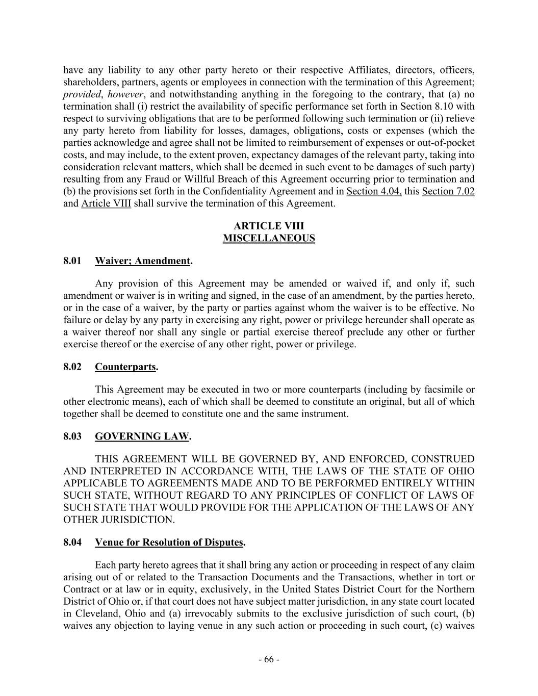 -66-就本协议的终止对本协议的任何其他方或其各自的关联公司、董事、高级职员、股东、合伙人、代理人或雇员承担任何责任;但是,尽管有上述任何相反的规定,但(a)任何终止均不得(i)限制第8.10节中规定的关于在该终止后将履行的尚存义务的特定履行的可用性,或(ii)免除本协议的任何一方对损失、损害、义务的责任,因在终止前发生的任何欺诈或故意违反本协议以及(b)《保密协议》和第4.04节中规定的条款、本第7.02节和第八条之规定而产生的费用或开支(双方承认并同意的不应限于偿还费用或自付费用,并可在已证明的范围内包括相关当事人的预期损害赔偿,同时考虑到相关事项,在这种情况下应被视为该当事人的损害赔偿)在本协议终止后仍然有效。第八条杂项8.01项放弃;修正。本协议的任何条款可予修订或放弃,条件是且仅当该等修订或放弃以书面形式作出,并在修订的情况下由本协议的各方签署,或在豁免的情况下由豁免生效的一方或多方签署。任何一方在行使本协议项下的任何权利、权力或特权方面的任何失败或拖延,均不得作为对该权利、权力或特权的放弃而运作,也不得排除任何单独或部分行使该权利或特权的任何其他或进一步行使或任何其他权利、权力或特权的行使。8.02对应方。本协议可由两个或两个以上的对应方(包括以传真或其他电子方式)签署,每一方应被视为构成原件,但所有这些共同应被视为构成同一文书。8.03管治法。本协议将由俄亥俄州法律管辖,并根据该法律执行、构建和解释,适用于在该州内已达成和将完全履行的协议,而不考虑将规定适用任何其他法域法律的任何该州法律冲突原则。8.04争议解决地点。本协议每一方同意,就交易文件和交易引起或与之相关的任何索赔,其应仅在美国俄亥俄州北区地方法院提起任何诉讼或程序,无论是在侵权或合同方面,还是在法律或股权方面,如果该法院没有标的管辖权,则在位于俄亥俄州克利夫兰的任何州法院提起,并且(a)不可撤销地服从该法院的专属管辖权,(b)放弃对在该法院提起任何此类诉讼或程序的任何异议,(c)豁免