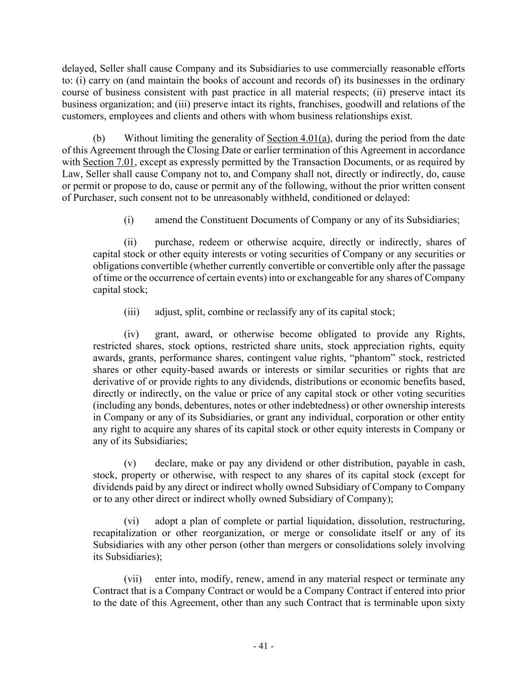 -41-延迟,卖方应促使公司及其子公司以商业上合理的努力:(i)在所有重大方面按照以往惯例在正常业务过程中继续(并维持其账簿和记录)其业务;(ii)保持其业务组织完整;(iii)保持其权利、特许经营权、商誉和客户以及与其存在业务关系的其他人的关系完整。(b)在不限制第4.01(a)节的一般性的情况下,在本协议日期至根据第7.01节本协议的结束日期或更早终止的期间内,除非交易文件明确允许,或法律要求,卖方应促使公司不这样做,且未经买方事先书面同意,公司不得直接或间接作出、促使或允许或提议作出、促使或允许作出以下任何一种行为,不应无理拒绝这种同意,有条件或延迟:(i)修订公司或其任何附属公司的组成文件;(ii)直接或间接购买、赎回或以其他方式收购股本股份或公司的其他股本权益或有表决权的证券或任何可转换为或可交换为公司股本任何股份的证券或义务(不论是目前可转换或仅在时间推移或发生某些事件后才可转换);(iii)调整、拆分、合并或重新分类其任何股本;(iv)授予、授予或以其他方式成为提供任何权利、限制性股份、股票期权、限制性股份单位的义务,股票增值权、股权奖励、授予、业绩份额、或有价值权、“幻影”股票、限制性股票或其他基于股权的奖励或权益或类似证券或权利,这些奖励或权益或权益是直接或间接基于任何股本或其他有表决权的证券(包括任何债券、债券、票据或其他债务)或公司或其任何子公司的价值或价格或其他所有权权益的派生或提供权利的任何股息、分配或经济利益,或授予任何个人,公司或其他实体收购其股本的任何股份或公司或其任何附属公司的其他股权的任何权利;(v)就其股本的任何股份(公司的任何直接或间接全资附属公司向公司或公司的任何其他直接或间接全资附属公司支付的股息除外)宣派、作出或支付任何股息或其他分派,以现金、股票、财产或其他方式支付;(vi)采取全部或部分清算、解散、重组、资本重组或其他重组的计划,或与任何其他人合并或合并本身或其任何附属公司(仅涉及其附属公司的合并或合并除外);(vii)订立、修改、续期、修订任何重大方面或终止任何属公司合约或如在本协议日期之前订立将属公司合约的合约,但任何可于60日终止的该等合约除外
