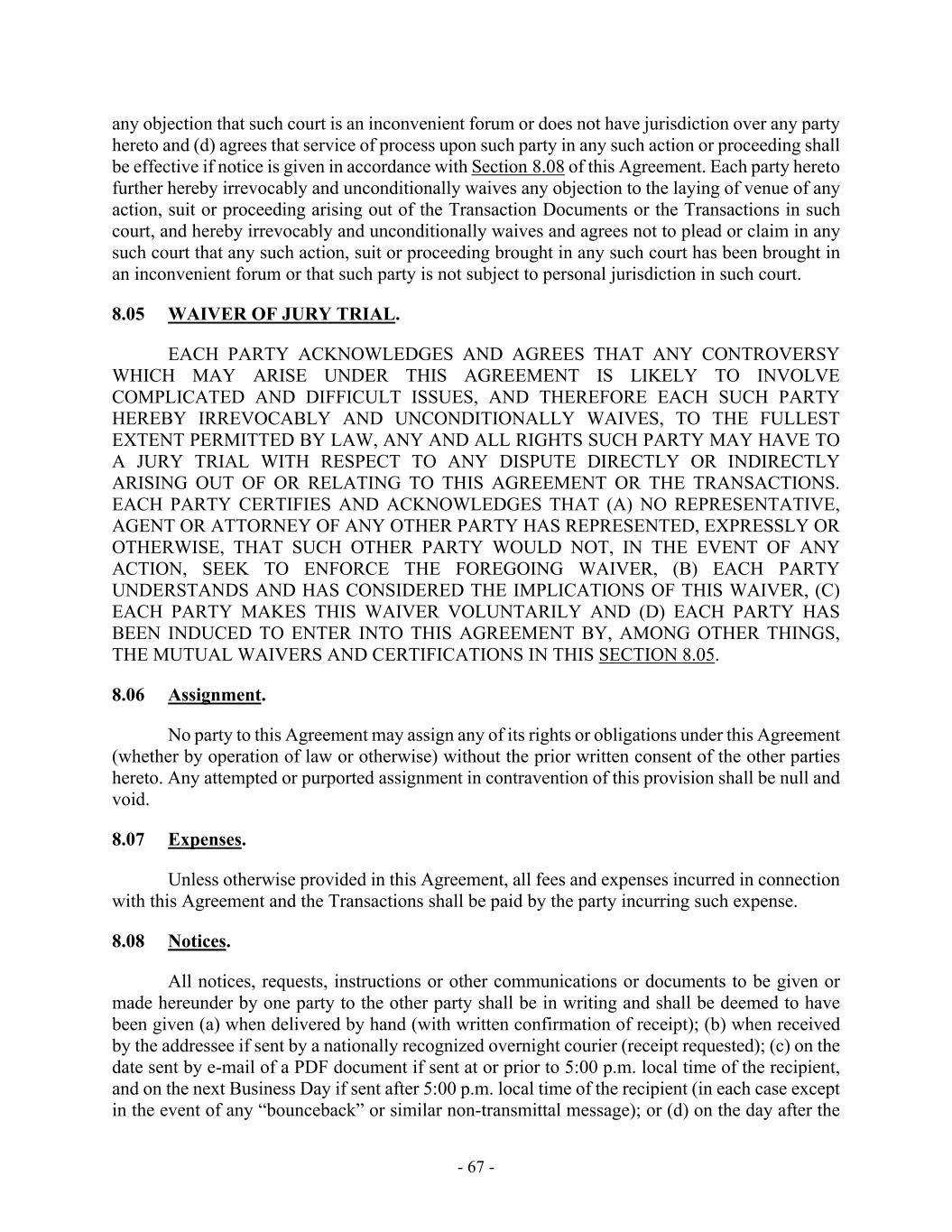 -67-任何关于该法院是不方便的法院或对本协议任何一方没有管辖权的异议,以及(d)同意在任何该等诉讼或程序中向该一方送达诉讼程序,如根据本协议第8.08节发出通知,则该异议应具有效力。本协议每一方进一步在此不可撤销和无条件地放弃对因交易文件或在该法院的交易而产生的任何诉讼、诉讼或程序奠定地点的任何异议,并在此不可撤销地和无条件地放弃并同意不在任何该等法院申辩或声称在任何该等法院提起的任何该等诉讼、诉讼或程序是在不方便的法院提起的,或该当事人不受该法院的属人管辖。8.05放弃陪审团审判。每一方都承认并同意,根据本协议可能产生的任何争议很可能涉及复杂和困难的问题,因此,每一方在此不可撤销和无条件地放弃,在法律允许的最充分范围内,这类当事人可能对任何争议直接或间接拥有陪审团审判的任何和所有权利每一方均证明并承认(a)任何其他方的代表、代理人或代理人均未明示或以其他方式代表该其他方在发生任何行动时不会寻求强制执行上述豁免,(b)每一方均理解并考虑了这一豁免的影响,(c)每一方均自愿作出这一豁免,并8.06作业。未经本协议其他各方事先书面同意,本协议任何一方不得转让其在本协议项下的任何权利或义务(无论是通过法律实施或其他方式)。任何试图或声称违反本条文的转让均属无效。8.07费用。除本协议另有规定外,与本协议及交易有关的一切费用和开支均由发生该等开支的一方支付。8.08次通知。一方根据本协议向另一方发出或作出的所有通知、请求、指示或其他通信或文件均应以书面形式发出,并应被视为(a)以专人送达(附收到的书面确认);(b)由国家认可的隔夜快递寄出的收件人收到时(要求收到的收据);(c)在收件人当地时间下午5:00或之前以PDF文件的电子邮件发送的日期,如果在收件人当地时间下午5:00之后发送(在每种情况下,除非发生任何“回弹”或类似的非传送电文),则在下一个工作日发送;或(d)在收件人当地时间下午5:00之后的第二天