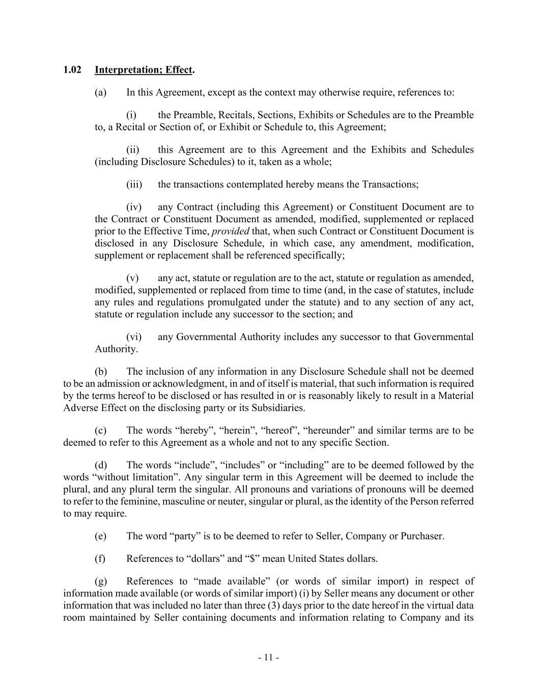 -11-1.02释义;效果。(a)在本协议中,除文意另有所指外,凡提述:(i)本协议的序言部分、朗诵部分、章节、展品或附表指的是本协议的一个朗诵部分或章节,或本协议的附件或附表;(ii)本协议是指本协议及其展品和附表(包括披露附表)作为一个整体;(iii)本协议所设想的交易是指交易;(iv)任何合同(包括本协议)或组成文件是指在生效时间之前经修订、修改、补充或替换的合同或组成文件,但前提是,当该等合约或组成文件在任何披露附表中披露时,在此情况下,任何修订、修改、补充或替换应具体提及;(v)任何法案、法规或规例是指不时修订、修改、补充或替换的法案、法规或规例(如属法规,则包括根据法规颁布的任何规则和条例),而任何法案、法规或规例的任何章节包括该章节的任何继承者;及(vi)任何政府当局包括该政府当局的任何继承者。(b)在任何披露附表中列入任何信息,不应被视为承认或承认本协议条款要求披露此类信息或已导致或合理可能导致对披露方或其子公司产生重大不利影响,这本身就是重大的。(c)“特此”、“特此”、“特此”、“特此”、“特此”、“特此”和类似条款应被视为指本协议整体,而不是指任何特定条款。(d)“包括”、“包括”或“包括”等字视为后接“不受限制”等字。本协议中的任何单数术语将被视为包括复数,任何复数术语将被视为单数。代词的所有代词和变体将被视为指女性、男性或中性、单数或复数,这是所指的人的身份可能要求的。(e)“当事人”一词应被视为指卖方、公司或买方。(f)提及“美元”和“美元”是指美元。(g)对卖方提供的信息(或类似进口的词语)(i)提及的“已提供”(或类似进口的词语)是指不迟于本协议日期前三(3)天包含在卖方维护的虚拟数据室中的任何文件或其他信息,其中包含与公司及其