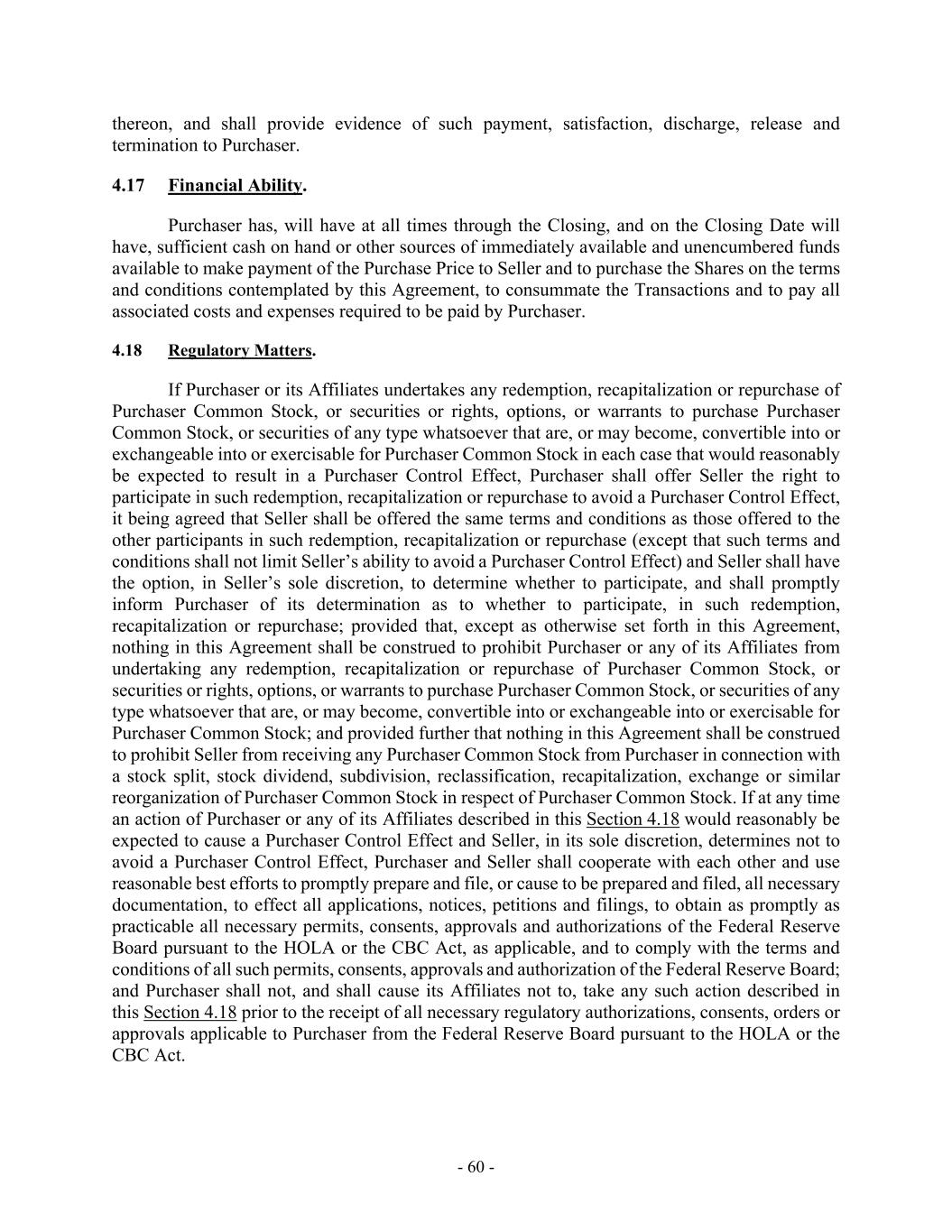 -60-上,并应向买方提供此类付款、满足、解除、解除和终止的证据。4.17财务Ability。买方在交割前的任何时候都将拥有,并且在交割日期将拥有足够的手头现金或其他可立即使用和未支配资金来源,以向卖方支付购买价款并根据本协议设想的条款和条件购买股份,以完成交易并支付买方需要支付的所有相关成本和费用。4.18监管事项。如果买方或其关联机构对买方普通股进行任何赎回、资本重组或回购,或为购买买方普通股而进行的证券或权利、期权或认股权证,或在每种情况下可或可能成为可转换为或可交换为买方普通股或可行使为买方普通股的任何类型的证券,而这些证券将合理地预期会导致买方控制效应,则买方应向卖方提供参与此类赎回、资本重组或回购的权利,以避免买方控制效应,同意向卖方提供与在此类赎回、资本重组或回购中向其他参与者提供的条款和条件相同的条款和条件(但此类条款和条件不应限制卖方避免买方控制效应的能力),卖方应有权自行决定是否参与,并应立即将其决定是否参与此类赎回、资本重组或回购的情况通知买方;但除本协议另有规定外,本协议中的任何内容均不得解释为禁止买方或其任何关联公司进行任何赎回、资本重组或回购买方普通股,或购买买方普通股的证券或权利、期权或认股权证,或任何类型的证券,这些证券是或可能成为可转换为或可交换为或可行使为买方普通股;并进一步规定,本协议中的任何内容均不得解释为禁止卖方从买方收到与股票分割、股票股息、细分、重新分类、资本重组有关的任何买方普通股,买方普通股的交换或类似重组。如果在任何时候,可以合理地预期本第4.18节中所述的买方或其任何关联公司的行动将导致买方控制效应,而卖方全权酌情决定不避免买方控制效应,则买卖双方应相互合作,尽最大努力迅速准备和归档,或促使准备和归档所有必要的文件,以实现所有申请、通知、请愿和归档,并在切实可行的范围内尽快获得所有必要的许可和同意,联邦储备委员会根据HOLA或CBC法案(如适用)的批准和授权,并遵守联邦储备委员会所有此类许可、同意、批准和授权的条款和条件;买方在收到联邦储备委员会根据HOLA或CBC法案适用于买方的所有必要监管授权、同意、命令或批准之前,不得也应促使其关联公司采取本第4.18节中所述的任何此类行动。