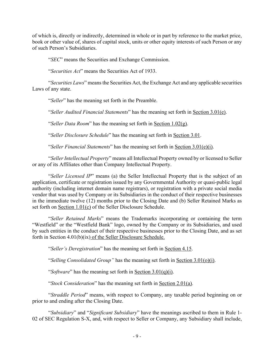 -9-其中直接或间接地参照该人或该人的任何附属公司的股本、单位或其他权益的市场价格、账面价值或其他价值确定全部或部分。“SEC”是指证券交易委员会。“证券法”是指1933年的《证券法》。“证券法”是指《证券法》、《交易法》和任何州的任何适用证券法。“卖方”具有序言中阐述的含义。“卖方经审计的财务报表”具有第3.01(e)节中规定的含义。“卖方数据室”具有第1.02(g)节规定的含义。“卖方披露时间表”具有第3.01节中规定的含义。“卖方财务报表”具有第3.01(e)(i)节中规定的含义。“卖方知识产权”是指除公司知识产权外,卖方或其任何关联公司拥有或许可的所有知识产权。“卖方许可知识产权”是指(a)作为任何政府机构或准公共法律机构(包括互联网域名注册商)签发的申请、证书或注册标的的卖方知识产权,或在截止日期前的紧接十二(12)个月内公司或其子公司用于开展各自业务的私人社交媒体供应商的注册,以及(b)卖方保留卖方披露附表第1.01(c)节规定的标记。“卖方保留标记”是指包含或包含“Westfield”或“Westfield Bank”标识的商标,由公司或其子公司拥有,并由此类实体在截止日期前开展各自业务时使用,并如卖方披露附表第4.01(b)(ix)节所述。“卖方注销登记”具有第4.15节规定的含义。“Selling Consolidated Group”具有第3.01(o)(i)节中规定的含义。“软件”具有第3.01(q)(i)节规定的含义。“股票对价”具有第2.01(a)节规定的含义。“跨座期”是指,就公司而言,在截止日期或之前开始并在截止日期之后结束的任何应税期间。“子公司”和“重要子公司”具有SEC法规S-X第1-02条赋予它们的含义,就卖方或公司而言,任何子公司应包括,