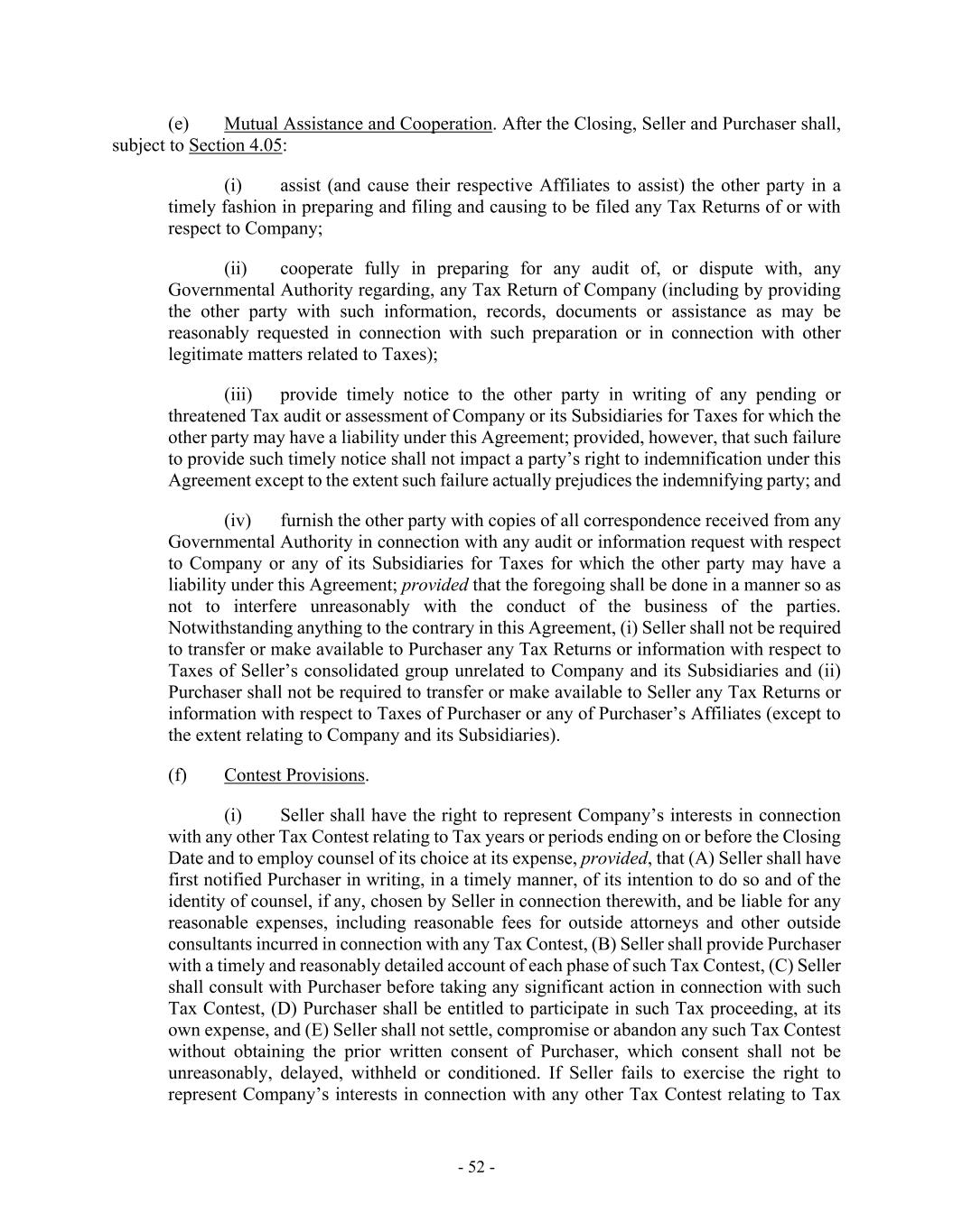 -52-(e)互助合作。交割后,在符合第4.05条的规定下,卖方和买方应:(i)协助(并促使其各自的关联公司协助)另一方及时编制和归档并促使提交公司的任何纳税申报表或与公司有关的任何纳税申报表;(ii)充分合作,准备对任何政府当局进行任何审计或与任何政府当局就公司的任何纳税申报表产生争议(包括向另一方提供此类信息、记录,与此种准备或与其他与税收有关的合法事项有关的合理要求的文件或协助);(iii)及时以书面通知另一方,就另一方可能根据本协议承担责任的公司或其子公司的任何未决或威胁的税务审计或评估;但前提是,未及时提供此类通知不应影响一方根据本协议获得赔偿的权利,除非该未及时提供实际上损害了赔偿方;(iv)向另一方提供从任何政府当局收到的与公司或其任何子公司有关的任何审计或信息请求有关的所有通信的副本,以支付另一方根据本协议可能负有责任的税款;条件是以不无理干扰当事人业务开展的方式进行前述尽管本协议有任何相反规定,(i)卖方无须转让或向买方提供与公司及其子公司无关的卖方合并集团的任何税务申报表或信息;(ii)买方无须转让或向卖方提供与买方或任何买方关联公司的税务有关的任何税务申报表或信息(与公司及其子公司有关的范围除外)。(f)竞赛规定。(i)卖方有权在与截止日期或之前结束的纳税年度或期间有关的任何其他税务竞赛中代表公司的利益,并有权聘请其选择的大律师,费用由其承担,但(a)卖方应已将其这样做的意图以及卖方就此选择的大律师的身份(如有的话)首先以书面形式通知买方,并对任何合理的费用承担责任,包括与任何税务竞赛有关的外部律师和其他外部顾问的合理费用,(b)卖方应向买方提供该税务竞赛每一阶段的及时和合理的详细说明,(c)卖方在就该税务竞赛采取任何重大行动之前应与买方协商,(d)买方有权自费参与该税务程序,以及(e)卖方不得在未获得买方事先书面同意的情况下解决、妥协或放弃任何该等税务竞赛,该同意不得无理、延迟、拒绝或附加条件。如卖方未能就与税务有关的任何其他税务竞赛行使代表公司利益的权利