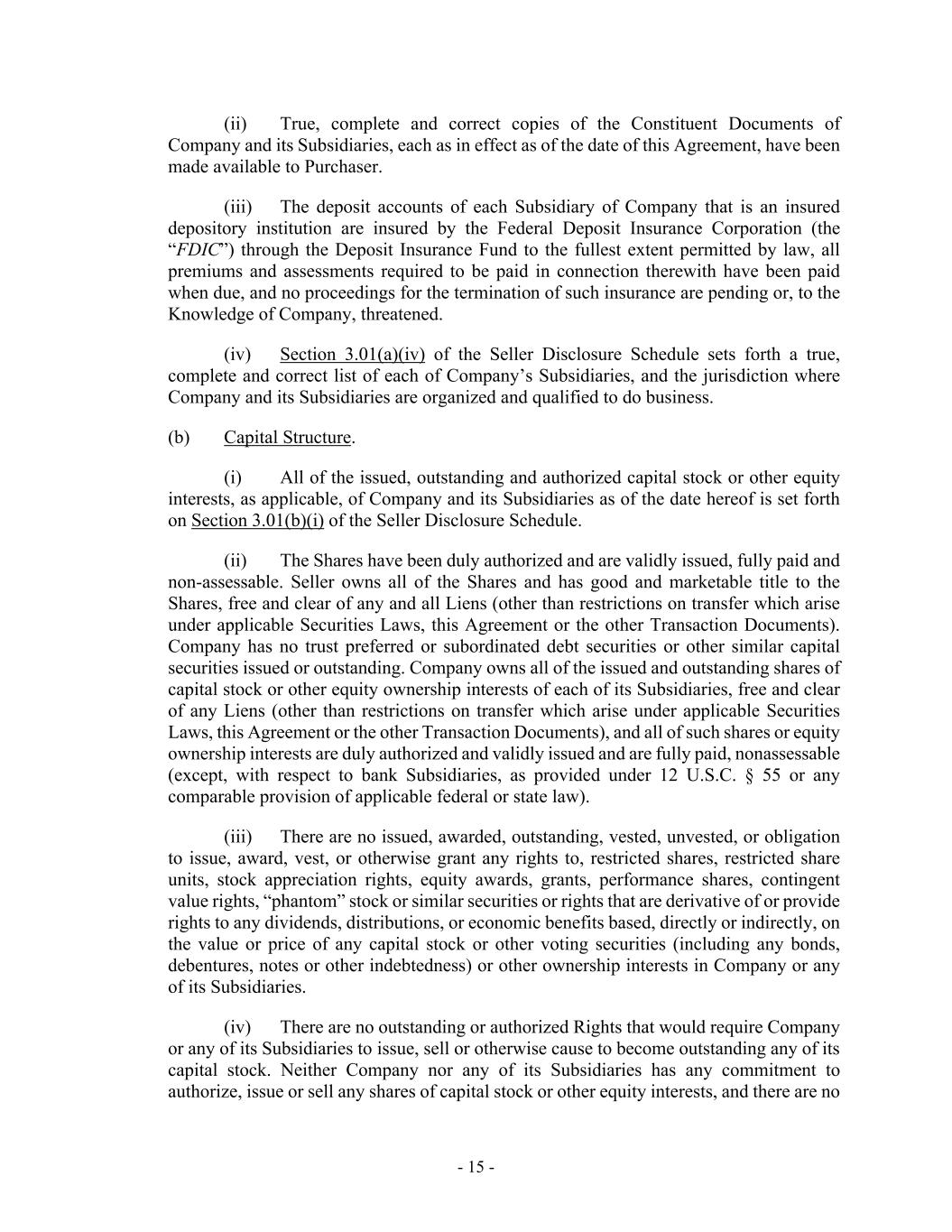 -15-(ii)公司及其附属公司的组成文件的真实、完整和正确的副本,每一份自本协议日期起生效,均已提供给买方。(iii)作为受保存款机构的公司各子公司的存款账户由联邦存款保险公司(“FDIC”)在法律允许的最大范围内通过存款保险基金投保,所有与此相关的保费和所需缴纳的评估已在到期时支付,并且没有任何终止此类保险的程序正在等待中,或者据公司所知,受到威胁。(iv)卖方披露附表第3.01(a)(iv)节列出了公司每个子公司的真实、完整和正确的清单,以及公司及其子公司组织和有资格开展业务的司法管辖区。(二)资本Structure。(i)卖方披露附表第3.01(b)(i)条载列公司及其附属公司截至本协议日期的所有已发行、未偿还及认可股本或其他适用股本权益。(ii)该等股份已获正式授权,并获有效发行、缴足股款及不可评税。卖方拥有全部股份,并对股份拥有良好且可上市销售的所有权,不存在任何和所有留置权(适用的证券法、本协议或其他交易文件下产生的转让限制除外)。公司没有发行或未发行的信托优先或次级债务证券或其他类似资本证券。公司拥有其每个子公司的所有已发行和流通股本或其他股权所有权权益,不受任何留置权(适用的证券法、本协议或其他交易文件下产生的转让限制除外),所有此类股份或股权所有权权益均获得正式授权和有效发行,并已全额支付,不可评估(银行子公司除外,根据12 U.S.C. § 55或适用的联邦或州法律的任何类似规定)。(iii)没有已发行、已授予、尚未发行、已归属、未归属或有义务发行、授予、归属或以其他方式授予任何权利、限制性股份、限制性股份单位、股票增值权、股权奖励、授予、业绩股份、或有价值权、“幻影”股票或类似证券或权利,这些证券或权利是直接或间接基于任何股本或其他有表决权证券(包括任何债券、债券、票据或其他债务)的价值或价格或公司或其任何子公司的其他所有权权益的派生或提供的任何股息、分配或经济利益的权利。(iv)不存在要求公司或其任何附属公司发行、出售或以其他方式导致其任何股本流通在外的未行使或授权权利。公司或其任何附属公司均不存在授权、发行或出售任何股本股份或其他股权的承诺,也不存在