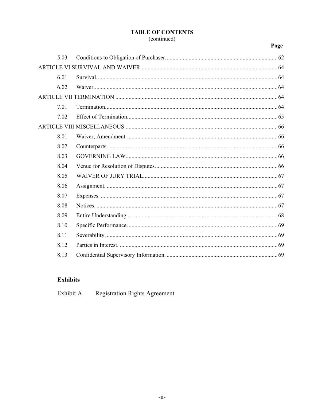 目录(续)第-III-5.03页买方义务的条件。....................................................................62第六条生存和放弃...................................................................................................6 46.01生存。...................................................................................................................6 46.02豁免。.......................................................................................................................64条第七条终止.......................................................................................................647.01终止。...................................................................................................................6 47.02终止效力。......................................................................................................65第八条杂项.....................................................................................................668.01放弃;修正。...................................................................................................668.02对应方。....................................................................................................668.03治理法。...................................................................................................668.04解决争议的场所。...................................................................................668.05放弃陪审团审判。...................................................................................678.06转让。...................................................................................................................6 78.07费用。...................................................................................................................678.08通知。...................................................................................................................678.09全程了解。...................................................................................................68 8.10具体表现。...................................................................................................6 98.11可分割性。...................................................................................................................6 98.12利害关系方。...................................................................................................6 98.13保密监管信息。....................................................................................69展品附件 A注册权协议