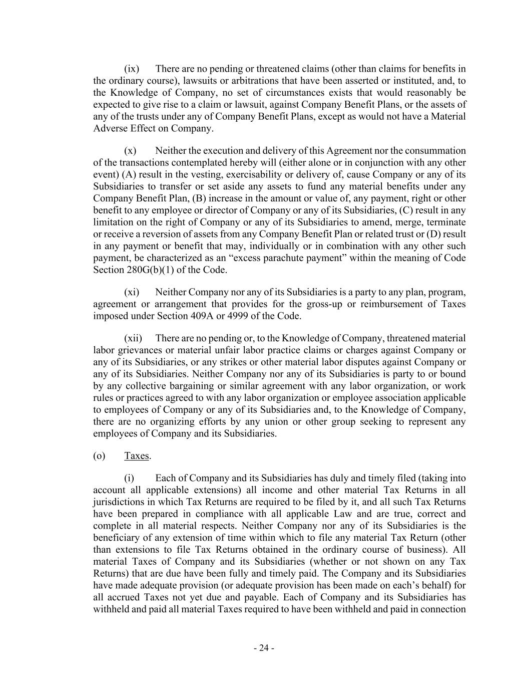 -24-(ix)不存在任何未决或威胁索赔(正常过程中的利益索赔除外)、已主张或提起的诉讼或仲裁,并且据公司所知,不存在合理预期会导致针对公司福利计划或任何公司福利计划下的任何信托资产的索赔或诉讼的一组情况,除非不会对公司产生重大不利影响。(x)本协议的执行和交付,或本协议所设想的交易的完成,均不会(单独或与任何其他事件一起)(a)导致公司或其任何附属公司的归属、可行使或交付,促使公司或其任何附属公司转移或拨出任何资产,以资助任何公司福利计划下的任何重大利益,(b)公司或其任何附属公司的任何雇员或董事的任何付款、权利或其他利益的金额或价值增加,(c)导致公司或其任何附属公司修订、合并、终止或从任何公司福利计划或相关信托收取资产返还的权利受到任何限制,或(d)导致任何付款或利益可能单独或与任何其他此类付款相结合,被定性为《守则》第280G(b)(1)条所指的“超额降落伞付款”。(xi)公司或其任何附属公司均不是任何计划、计划、协议或安排的缔约方,这些计划、计划、协议或安排规定了根据《守则》第409A或4999条征收的税款的总额或偿还。(xii)本公司或其任何附属公司并无任何待决或据公司所知,有威胁的重大劳工申诉或重大不公平劳工实践索赔或指控,或针对本公司或其任何附属公司的任何罢工或其他重大劳工纠纷。公司或其任何附属公司均不是与任何劳工组织的任何集体谈判或类似协议的一方或受其约束,或与适用于公司或其任何附属公司的雇员的任何劳工组织或雇员协会商定的工作规则或惯例,并且据公司所知,没有任何工会或其他团体寻求代表公司及其附属公司的任何雇员的组织努力。(o)税收。(i)各公司及其附属公司均已在其须提交报税表的所有法域妥为及及时地提交(考虑到所有适用的延期)所有收入及其他重要报税表,而所有该等报税表均已遵照所有适用法律编制,并在所有重要方面均属真实、正确及完整。本公司或其任何附属公司均不是任何延长提交任何重要税务申报表的时间的受益人(在正常业务过程中获得的延长提交税务申报表的时间除外)。公司及其子公司(无论是否在任何纳税申报表上显示)应缴的所有重大税款均已足额、及时缴纳。本公司及其附属公司已就所有尚未到期应付的应计税项作出充分拨备(或已代各自作出充分拨备)。各公司及其子公司代扣代缴了所有需要代扣代缴的物税