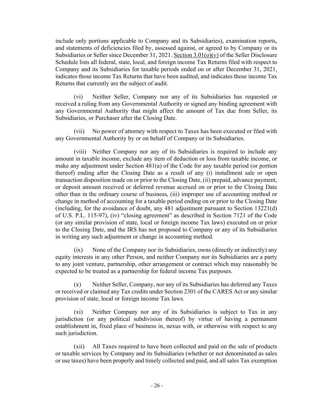 -26-仅包括适用于公司及其子公司的部分)、审查报告,以及自2021年12月31日以来由公司或其子公司或卖方提交、评估或同意的缺陷声明。卖方披露附表第3.01(o)(v)节列出了截至2021年12月31日或之后的纳税期间就公司及其子公司提交的所有联邦、州、地方和外国所得税申报表,表明了那些已被审计的所得税申报表,并表明了那些目前作为审计对象的所得税申报表。(vi)卖方、公司或其任何附属公司均未要求或收到任何政府当局的裁决,或与任何政府当局签署任何可能影响截止日期后卖方、其附属公司或买方应缴税额的具有约束力的协议。(vii)公司或其附属公司或其代表并无签立或向任何政府当局提交有关税务的授权书。(viii)公司或其任何附属公司均无须将任何金额计入应课税收入、排除应课税收入的任何扣除或亏损项目,或根据《守则》第481(a)条对截止日期后结束的任何课税期间(或其部分)作出任何调整,原因是任何(i)在截止日期或之前作出的分期出售或公开交易处置,(ii)预付、预付款或已收存款金额或在截止日期或之前产生的递延收入,但在正常业务过程中除外,(iii)在截止日期或之前结束的应课税期内不当使用会计方法或会计方法变更(为免生疑问,包括根据美国P.L.115-97第13221(d)条进行的任何481调整),(iv)在截止日期或之前执行的《守则》第7121条(或州、地方或外国所得税法的任何类似规定)中所述的“结束协议”,并且IRS没有向公司或其任何子公司书面提出任何此类会计方法调整或变更。(ix)公司或其附属公司均不拥有(直接或间接)任何其他人的任何股权,公司或其附属公司均不是任何合营企业、合伙企业、其他安排或合同的一方,而这些安排或合同可能合理地被预期为联邦所得税目的的合伙企业。(x)卖方、公司或其任何子公司均未根据《CARES法》第2301条或州、地方或外国所得税法的任何类似条款推迟缴纳任何税款或收到或要求获得任何税收抵免。(xi)公司或其任何附属公司均不因在任何司法管辖区(或其任何政治分区)拥有常设机构、在任何该等司法管辖区的固定营业地点、与任何该等司法管辖区有联系或以其他方式与该等司法管辖区有关而须缴税。(十二)公司及子公司销售产品或应税劳务所需已征收的全部税款(无论是否以销售、使用税计值)均已适当、及时征缴,全部免征销售税