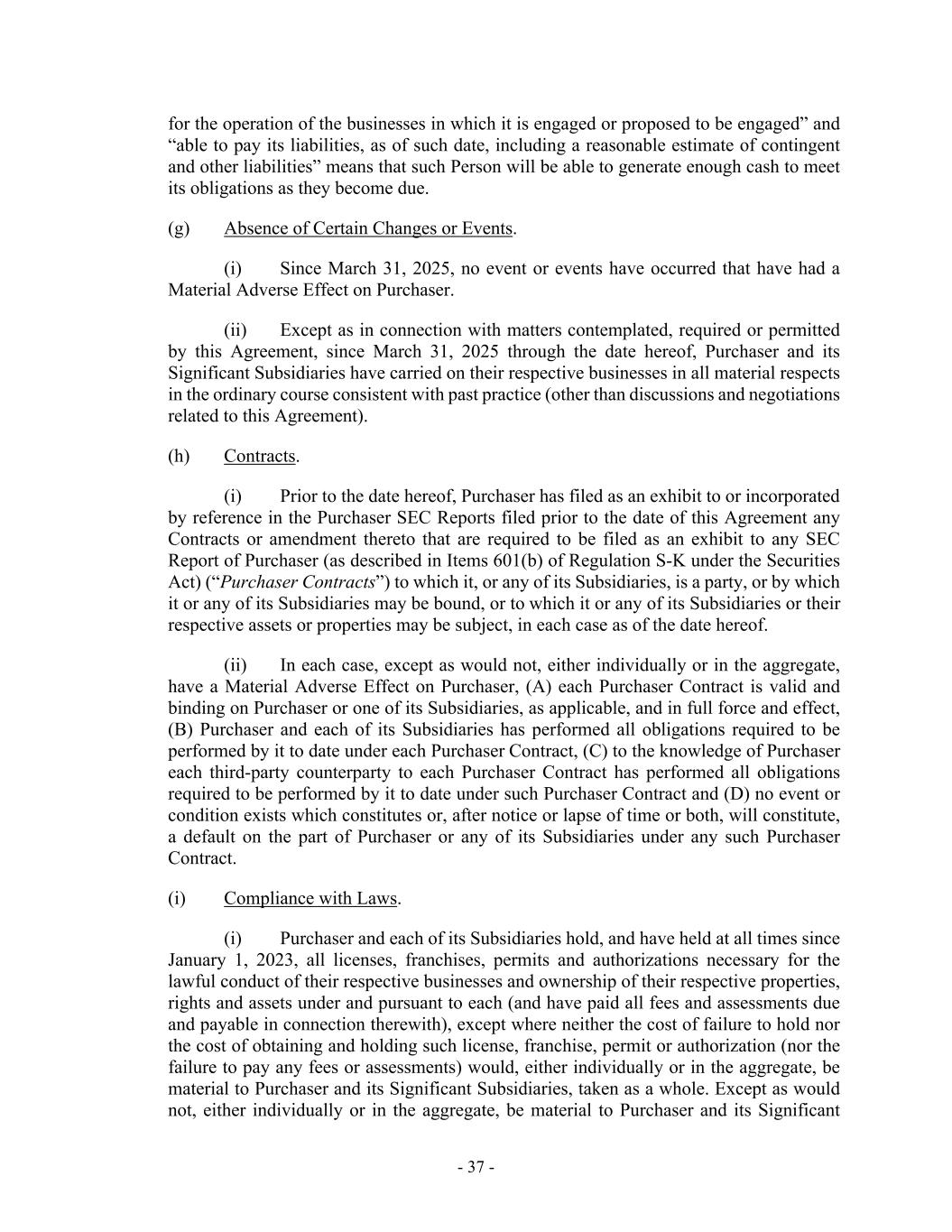 -37-就其所从事或拟从事的业务的运营而言”和“能够支付其负债,截至该日期,包括对或有负债和其他负债的合理估计”意味着该人将能够产生足够的现金来履行其到期债务。(g)不存在某些变化或事件。(i)自2025年3月31日以来,未发生对买方产生重大不利影响的事件或事项。(二)除与本协议所设想、要求或允许的事项有关外,自2025年3月31日至本协议日期,买方及其重要子公司在所有重大方面均按照以往惯例(与本协议有关的讨论和谈判除外)在正常过程中开展各自的业务。(h)合同。(i)在本协议日期之前,买方已向在本协议日期之前提交的买方SEC报告中提交或以引用方式并入其或其任何子公司可能受其约束的任何合同或其修订要求作为证据提交的买方的任何SEC报告(如《证券法》规定的S-K条例第601(b)项所述)(“买方合同”),或其或其任何附属公司或其各自的资产或财产可能受制于,在每种情况下,截至本协议日期。(ii)在每种情况下,除个别或合计不会对买方产生重大不利影响外,(a)每份买方合同均有效,并对买方或其任何一家子公司(如适用)具有约束力,且具有充分的效力和效力,(b)买方及其每一家子公司已履行了其迄今为止根据每份买方合同须履行的所有义务,(c)据买方所知,每份买方合同的每一第三方相对人已履行了迄今为止根据该买方合同要求其履行的所有义务,以及(d)不存在构成或在通知或时间流逝后或两者兼而有之将构成买方或其任何子公司在任何该买方合同下的违约的事件或条件。(i)遵守法律。(i)买方及其各附属公司持有且自2023年1月1日以来一直持有合法开展其各自业务所需的所有执照、特许经营权、许可和授权以及各自根据和依据各自拥有的各自财产、权利和资产的所有权(并已支付与此相关的所有到期和应付的费用和评估),除非未能持有的成本或获得和持有该等执照、特许经营权、许可或授权的成本(或未能支付任何费用或评估)均不会单独或合计,对买方及其重要子公司构成重大影响,整体来看。除非单独或合计不会对买方及其重大