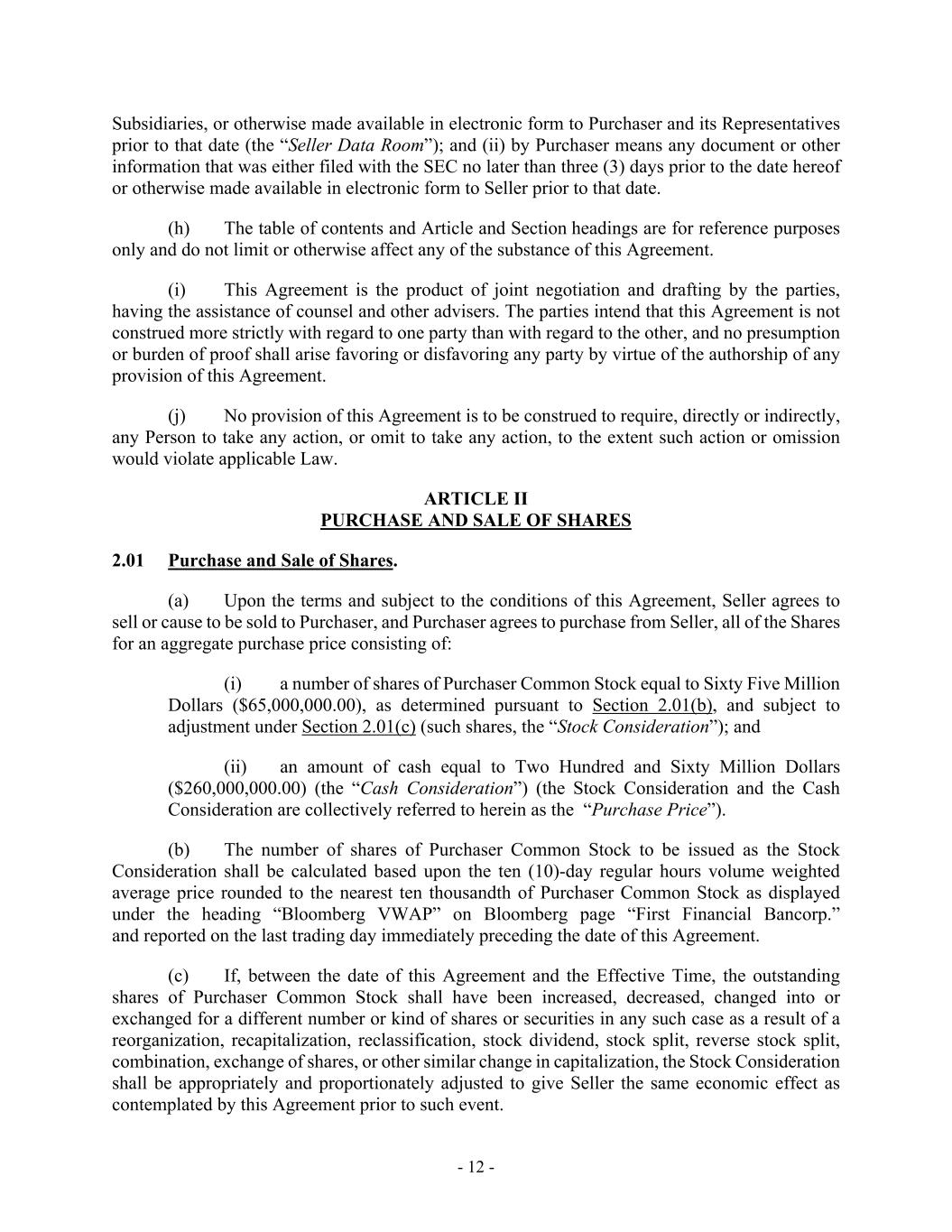 -12-子公司,或在该日期之前以其他方式以电子形式提供给买方及其代表(“卖方数据室”);(ii)由买方提供是指不迟于本协议日期之前三(3)天向SEC提交的任何文件或其他信息,或在该日期之前以其他方式以电子形式提供给卖方的任何文件或其他信息。(h)目录以及条款和章节标题仅供参考,不限制或以其他方式影响本协定的任何实质内容。(i)本协议是双方在律师和其他顾问协助下共同谈判和起草的产物。各方打算本协议对一方的解释不比对另一方的解释更严格,不得因本协议任何条款的作者身份而产生有利于或不利于任何一方的推定或举证责任。(j)本协议的任何条款不得解释为要求任何人直接或间接采取任何行动,或不采取任何行动,只要这种行动或不作为将违反适用法律。第二条买卖股份2.01股份买卖。(a)根据本协议的条款和条件,卖方同意出售或促使出售给买方,且买方同意向卖方购买全部股份,总购买价格包括:(i)根据第2.01(b)节确定的相当于6,500万美元(65,000,000.00美元)的买方普通股的若干股份,并可根据第2.01(c)节进行调整(此类股份,“股票对价”);(ii)相当于2亿6千万美元(260,000,000.00美元)的现金(“现金对价”)(股票对价和现金对价在此统称为“购买价格”)。(b)将作为股票对价发行的买方普通股的股份数量应根据彭博页面“第一金融银行股份”“Bloomberg VWAP”标题下显示并在紧接本协议日期前的最后一个交易日报告的十(10)天正常时间成交量加权平均价格四舍五入至买方普通股的万分之一计算。(c)如果在本协议日期和生效时间之间,买方普通股的已发行股份在任何此类情况下因重组、资本重组、重新分类、股票股息、股票分割、反向股票分割、合并、股份交换或其他类似的资本化变化而增加、减少、变更为或交换不同数量或种类的股份或证券,则股票对价应适当和按比例调整,以给予卖方在此事件发生前本协议所设想的相同经济效果。