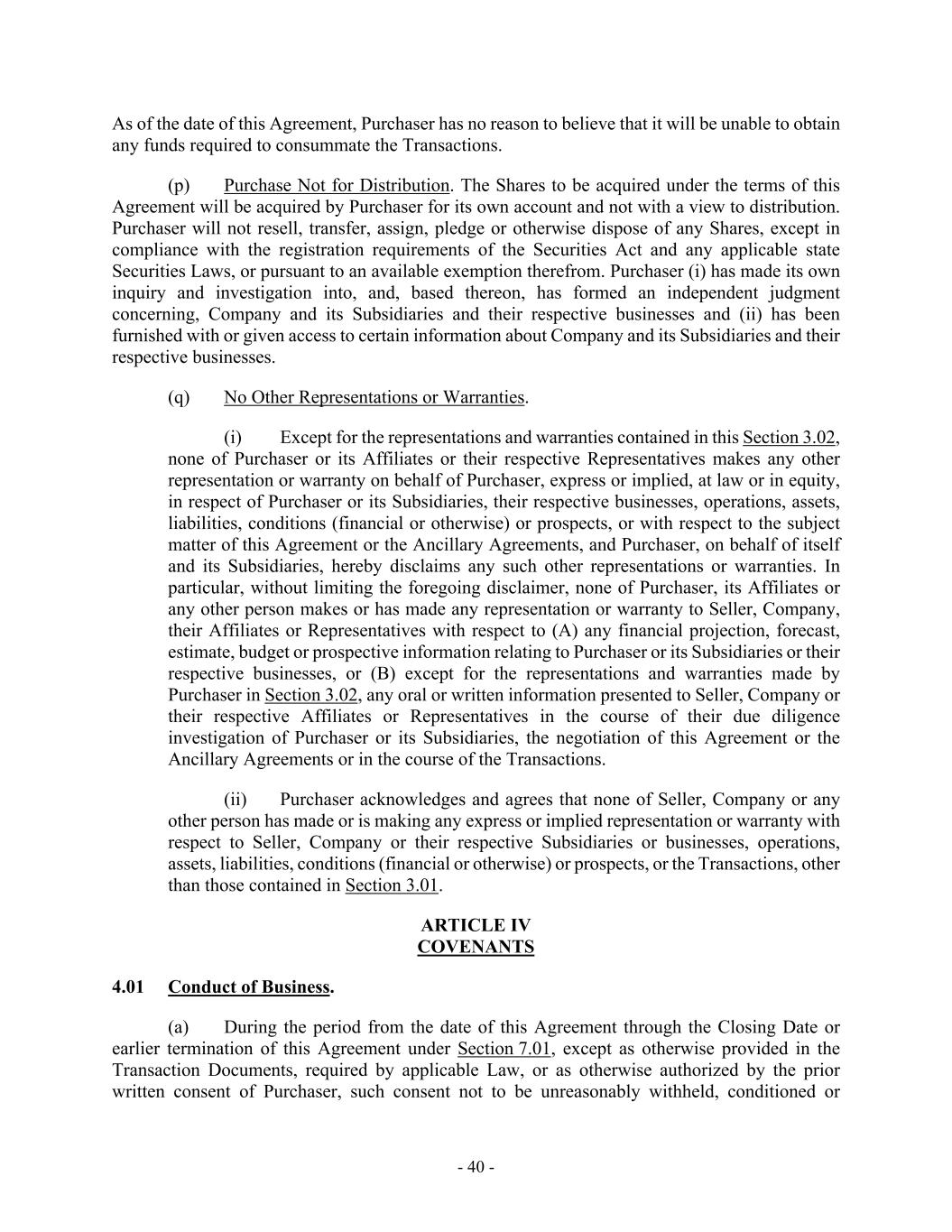 -40-截至本协议之日,买方没有理由认为其将无法获得完成交易所需的任何资金。(p)不为分配而购买。根据本协议条款将获得的股份将由买方为自己的账户而不是为了分配而获得。买方不会转售、转让、转让、质押或以其他方式处置任何股份,除非符合《证券法》和任何适用的州证券法的登记要求,或根据可获得的豁免。买方(i)已自行对公司及其附属公司及其各自业务作出查询和调查,并据此形成独立判断,及(ii)已向其提供或获准查阅有关公司及其附属公司及其各自业务的某些信息。(q)无其他申述或保证。(i)除本条第3.02条所载的陈述和保证外,买方或其关联公司或其各自的代表均未代表买方就买方或其子公司、其各自的业务、经营、资产、负债、条件(财务或其他)或前景,或就本协议或附属协议的标的事项,在法律上或在权益上明示或默示作出任何其他陈述或保证,而买方代表其本身及其子公司,特此否认任何该等其他陈述或保证。特别是,在不限制上述免责声明的情况下,买方、其关联公司或任何其他人均未就(a)与买方或其子公司或其各自业务有关的任何财务预测、预测、估计、预算或预期信息,或(b)除买方在第3.02节中作出的陈述和保证外,向卖方、公司或其各自关联公司或代表在其对买方或其子公司的尽职调查过程中提出的任何口头或书面信息,向卖方、公司或其各自关联公司或代表作出或已经作出任何陈述或保证,本协议或附属协议的谈判或交易过程中的谈判。(ii)买方承认并同意,卖方、公司或任何其他人均未就卖方、公司或其各自的子公司或业务、运营、资产、负债、条件(财务或其他)或前景或交易作出或正在作出任何明示或暗示的陈述或保证,但第3.01节所载的那些除外。第四条盟约4.01经营行为。(a)在本协议日期至本协议结束日期或根据第7.01条提前终止的期间内,除交易文件另有规定、适用法律要求或买方事先书面同意另有授权外,此种同意不得被无理拒绝、附加条件或
