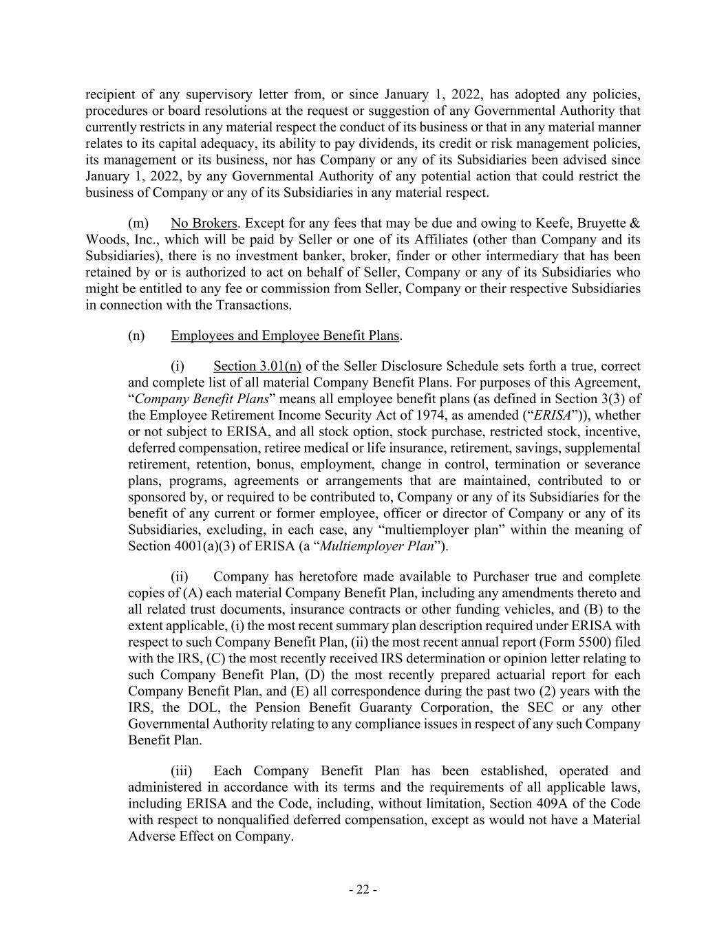 -22-自2022年1月1日起或自2022年1月1日起收到任何监管函件的收件人,已应任何政府当局的请求或建议通过任何政策、程序或董事会决议,这些政策、程序或决议目前在任何重大方面限制其业务的开展,或在任何重大方面与其资本充足率、其支付股息的能力、其信用或风险管理政策、其管理层或其业务相关,自2022年1月1日起,公司或其任何子公司也未被告知,由任何政府当局作出可能在任何重大方面限制公司或其任何附属公司业务的任何潜在行动。(m)没有经纪人。除可能到期应付Keefe,Bruyette & Woods,Inc.的任何费用将由卖方或其关联公司之一(公司及其子公司除外)支付外,没有任何投资银行家、经纪人、发现者或其他中介机构已被卖方、公司或其任何子公司聘请或被授权代表其行事,他们可能有权从卖方、公司或其各自的子公司获得与交易有关的任何费用或佣金。(n)雇员和雇员福利计划。(i)卖方披露附表第3.01(n)节列出了所有重要的公司福利计划的真实、正确和完整的清单。就本协议而言,“公司福利计划”是指所有雇员福利计划(定义见经修订的1974年《雇员退休收入保障法》(“ERISA”)第3(3)节),无论是否受ERISA的约束,以及所有股票期权、股票购买、限制性股票、激励、递延补偿、退休人员医疗或人寿保险、退休、储蓄、补充退休、保留、奖金、雇用、控制权变更、终止或遣散计划、计划、计划、协议或安排,这些计划、协议或安排由维持、贡献或赞助,或被要求贡献,公司或其任何子公司为公司或其任何子公司的任何现任或前任雇员、高级职员或董事的利益,在每种情况下均不包括ERISA第4001(a)(3)节所指的任何“多雇主计划”(“多雇主计划”)。(ii)公司迄今已向买方提供(a)每份重要公司福利计划的真实完整副本,包括对其的任何修订以及所有相关的信托文件、保险合同或其他筹资工具,以及(b)在适用范围内,(i)根据ERISA要求的有关该公司福利计划的最近的简要计划说明,(ii)向IRS提交的最近年度报告(表格5500),(c)最近收到的IRS与该公司福利计划有关的确定或意见函,(d)最近为每个公司福利计划编制的精算报告,及(e)在过去两(2)年内与IRS、DOL、Pension Benefit Guaranty Corporation、SEC或任何其他政府当局就任何该等公司福利计划的任何合规问题的所有通信。(iii)每份公司福利计划均已根据其条款和所有适用法律(包括ERISA和《守则》)的要求建立、运营和管理,包括但不限于《守则》关于不合格递延补偿的第409A条,但不会对公司产生重大不利影响的除外。