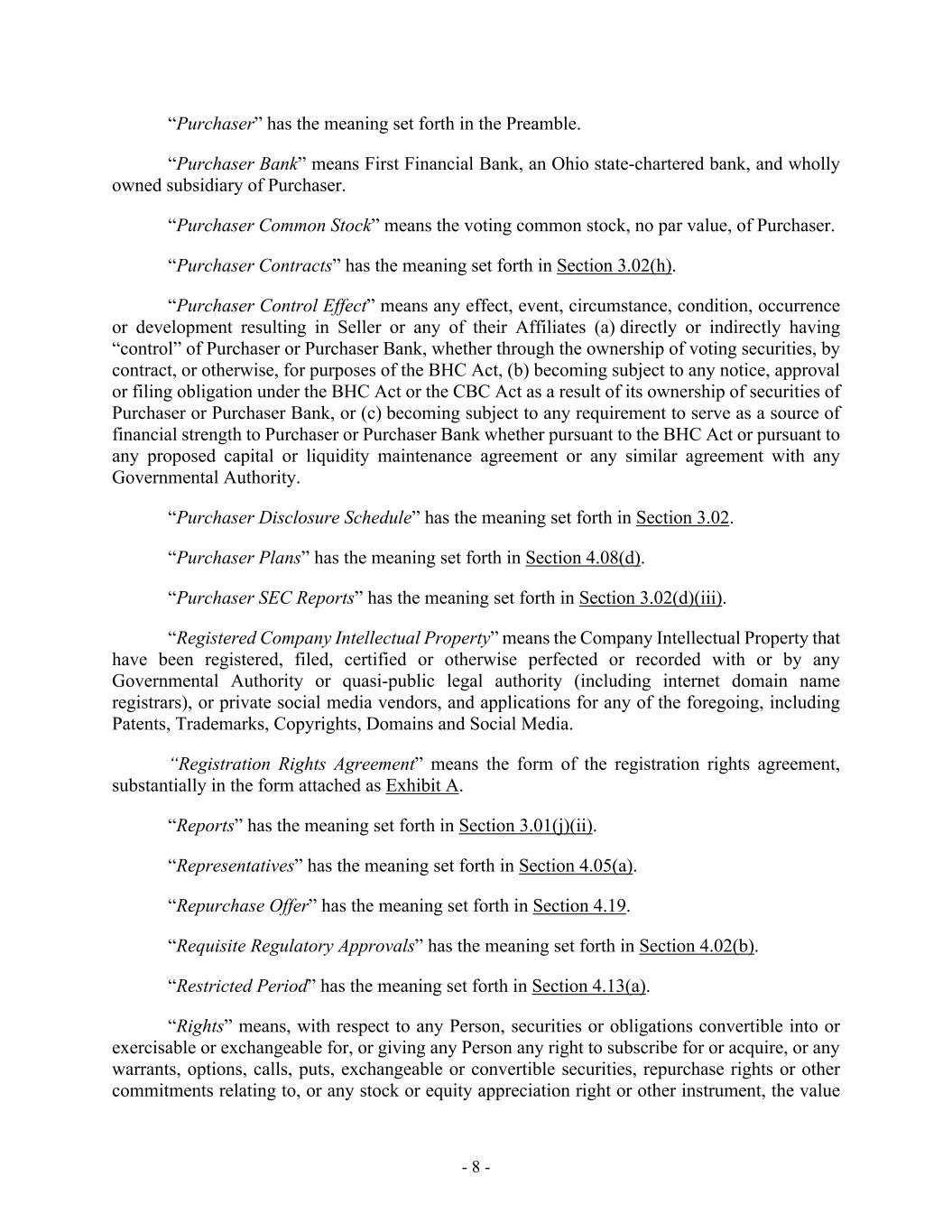 -8-“买方”具有序言中阐述的含义。“买方银行”是指第一财务银行,是一家俄亥俄州特许银行,是买方的全资子公司。“买方普通股”是指买方有表决权的普通股,无面值。“买方合同”具有第3.02(h)节规定的含义。“买方控制效应”是指导致卖方或其任何关联公司(a)直接或间接拥有买方银行或买方银行“控制权”的任何影响、事件、情况、条件、发生或发展,无论是通过投票证券的所有权、通过合同或其他方式,就《BHC法案》而言,(b)由于其对买方银行或买方银行证券的所有权而成为《BHC法案》或CBC法案规定的任何通知、批准或备案义务的约束,或(c)成为受制于作为买方银行或买方银行资金实力来源的任何要求,无论是根据《BHC法案》还是根据任何拟议的资本或流动性维持协议或与任何政府当局的任何类似协议。“买方披露时间表”具有第3.02节中规定的含义。“买方计划”具有第4.08(d)节规定的含义。“买方SEC报告”具有第3.02(d)(iii)节中规定的含义。“注册公司知识产权”是指已向任何政府机构或准公共法律机构(包括互联网域名注册商)或私人社交媒体供应商注册、备案、认证或以其他方式完善或记录的公司知识产权,以及上述任何一项的申请,包括专利、商标、版权、域名和社交媒体。“注册权协议”是指注册权协议的形式,基本上采用作为附件 A所附的形式。“报告”具有第3.01(j)(ii)节中规定的含义。“代表”具有第4.05(a)节规定的含义。“回购要约”具有第4.19节规定的含义。“必要的监管批准”具有第4.02(b)节中规定的含义。“限制期”具有第4.13(a)节规定的含义。“权利”是指,就任何人而言,可转换为或可行使或可交换的证券或义务,或给予任何人任何认购或取得的权利,或任何认股权证、期权、看涨期权、看跌期权、可交换或可转换证券、回购权或其他有关的承诺,或任何股票或股权增值权或其他文书的价值