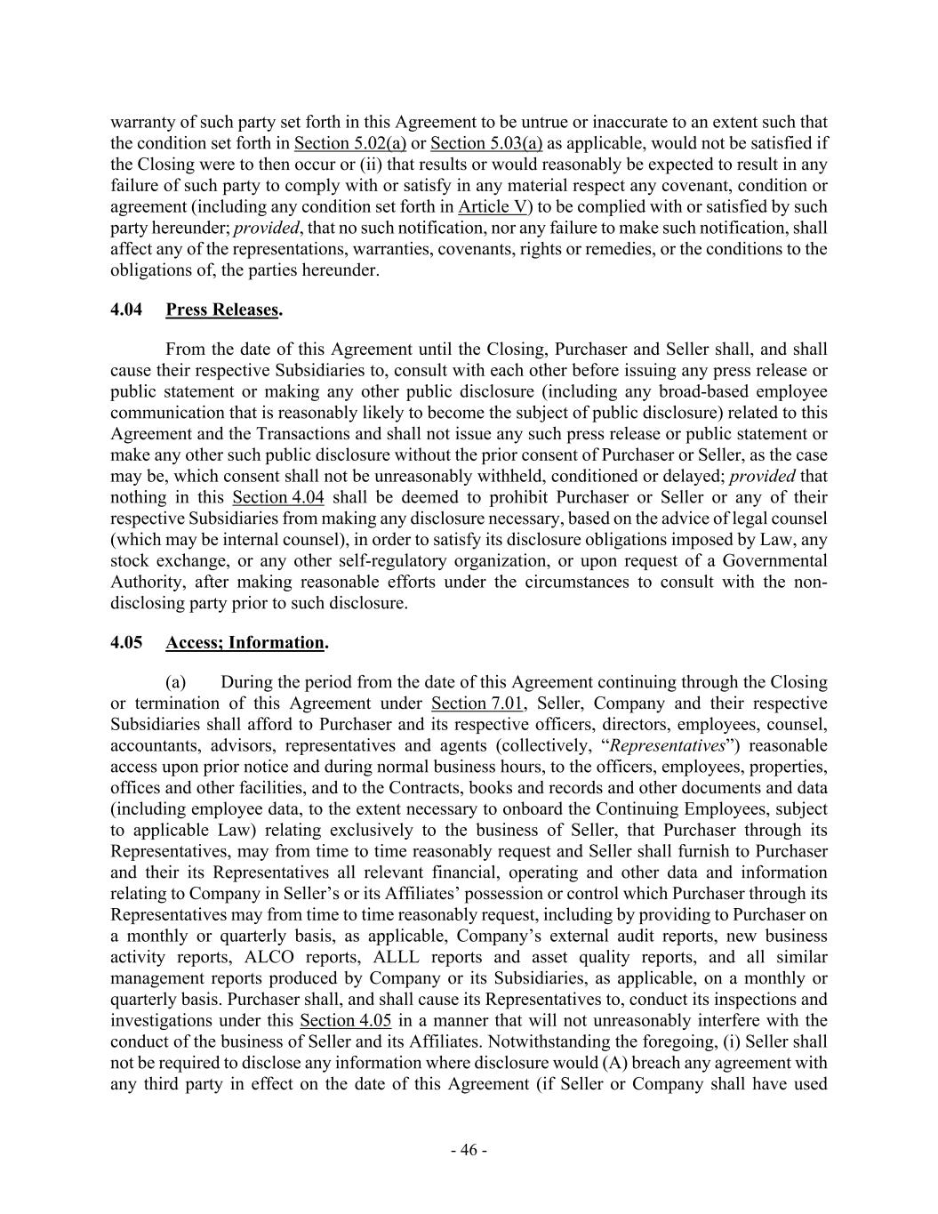 -46-本协议中规定的该方的保证不真实或不准确,以致于第5.02(a)节或第5.03(a)节(如适用)中规定的条件,如果随后发生关闭,或(ii)导致或合理地预期将导致该方未能在任何重大方面遵守或满足该方根据本协议应遵守或满足的任何契诺、条件或协议(包括第V条中规定的任何条件),则不满足,亦不作出该等通知,均不影响本协议项下各方的任何陈述、保证、契诺、权利或补救措施,或对其义务的条件。4.04新闻稿。自本协议之日起至交易结束,买卖双方在发布与本协议和交易相关的任何新闻稿或公开声明或进行任何其他公开披露(包括合理可能成为公开披露主题的任何基础广泛的员工沟通)之前,应并应促使其各自的子公司相互协商,未经买卖双方(视情况而定)事先同意,不得发布任何此类新闻稿或公开声明或进行任何其他此类公开披露,不得无理拒绝、附加条件或延迟表示同意;但本条第4.04款中的任何规定均不得被视为禁止买方或卖方或其各自的任何子公司根据法律顾问(可能是内部顾问)的建议进行任何必要的披露,以履行其根据法律、任何证券交易所或任何其他自律组织规定的披露义务,或应政府当局的请求,在做出合理努力的情况下在披露前与未披露方进行磋商后,进行必要的披露。4.05准入;信息。(a)在本协议持续至本协议根据第7.01条结束或终止之日起的期间内,卖方、公司及其各自的子公司应允许买方及其各自的高级职员、董事、雇员、大律师、会计师、顾问、代表和代理人(统称“代表”)在事先通知后并在正常营业时间内合理访问高级职员、雇员、财产、办公室和其他设施,以及合同、账簿和记录以及其他文件和数据(包括雇员数据,在持续雇员入职所需的范围内,在适用法律允许的情况下)与卖方业务有关的,买方通过其代表可不时合理要求且卖方应向买方及其代表提供买方通过其代表可不时合理要求的与卖方或其关联公司拥有或控制的公司有关的所有相关财务、经营和其他数据和信息,包括通过每月或每季度(如适用)向买方提供公司的外部审计报告、新业务活动报告、ALCO报告、ALCO报告、ALLL报告和资产质量报告,以及公司或其子公司(如适用)按月或按季度编制的所有类似管理报告。买方应并应促使其代表根据本条第4.05款进行其检查和调查,其方式不会无理干扰卖方及其关联公司的业务开展。尽管有上述规定,(i)卖方不应被要求披露任何信息,如果披露将(a)违反与任何第三方在本协议日期生效的任何协议(如果卖方或公司应已使用
