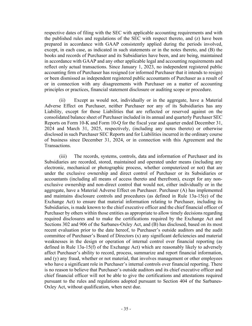 -35-向SEC提交适用会计要求和SEC已公布的相关规则和条例的相应日期,以及(z)已按照所涉期间一贯适用的公认会计原则编制,但在每种情况下,此类报表或其附注中所述除外,以及(b)买方及其子公司的账簿和记录一直并正在按照公认会计原则和任何其他适用的法律和会计要求进行维护,并且仅反映实际交易。自2023年1月1日以来,没有买方的独立注册会计师事务所因与买方在会计原则或惯例、财务报表披露或审计范围或程序事项上存在任何分歧而辞职(或告知买方其打算辞职)或被解聘为买方的独立注册会计师。(ii)除个别或总体上不会对买方产生重大不利影响外,买方或其任何子公司均不承担任何责任,但在买方的合并资产负债表中反映或保留的负债除外,这些负债分别包含在其截至2024年12月31日和2025年3月31日的财政年度和季度的10-K表格和10-Q表格的年度和季度买方SEC报告中,(包括其任何附注)或在该等买方SEC报告中以其他方式披露,以及自2024年12月31日以来在正常业务过程中产生的负债,或与本协议和交易有关的负债。(iii)买方及其子公司的记录、系统、控制、数据和信息是根据买方或其子公司或会计师专属所有权和直接控制的手段(包括任何电子、机械或照相过程,无论是否计算机化)记录、存储、维护和操作的,但不会单独或总体上对买方产生重大不利影响的任何非专属所有权和非直接控制除外。买方(a)已实施并维持披露控制和程序(定义见《交易法》第13a-15(e)条),以确保与买方(包括其子公司)有关的重要信息由这些实体内的其他人酌情告知买方的首席执行官和首席财务官,以便及时就所需披露作出决定,并作出《交易法》和《萨班斯-奥克斯利法案》第302和906节要求的证明,并且(b)已根据其在本协议日期之前的最近一次评估披露,致买方外部审计员和买方董事会审计委员会(x)财务报告内部控制的设计或运作(定义见《交易法》第13a-15(f)条)中合理可能对买方记录、处理、汇总和报告财务信息的能力产生不利影响的任何重大缺陷和重大弱点,以及(y)涉及管理层或在买方财务报告内部控制中具有重要作用的其他雇员的任何欺诈行为,无论是否重大。没有理由相信买方的外部审计员及其首席执行官和首席财务官将无法在下次到期时无条件地提供根据《萨班斯-奥克斯利法案》第404条通过的规则和条例所要求的认证和证明。