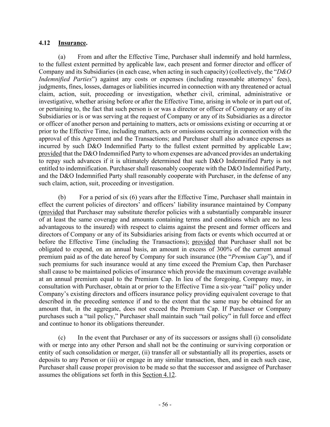 -56-4.12保险。(a)自生效时间起及之后,买方应在适用法律允许的最大范围内,对公司及其子公司的每位现任和前任董事和高级管理人员(在每种情况下,在以该身份行事时)(统称为“D & O获弥偿方”)就任何与任何威胁或实际索赔、诉讼、诉讼、诉讼、程序或调查(无论是民事、刑事、行政或调查)有关的任何费用或开支(包括合理的律师费)、判决、罚款、损失、损害赔偿或责任(无论是在生效时间之前或之后产生的、全部或部分由,或有关该人是或曾经是公司或其任何附属公司的董事或高级人员,或正在或正在应公司或其任何附属公司的要求担任另一人的董事或高级人员,并与在生效时间或之前存在或发生的事项、作为或不作为有关,包括事项,因批准本协议和交易而发生的作为或不作为;买方还应在适用法律允许的最大范围内垫付该D & O受偿方发生的费用;但如果最终确定该D & O受偿方无权获得赔偿,则被垫付费用的D & O受偿方提供偿还该垫款的承诺。买方应与D & O受赔方合理合作,而D & O受赔方应与买方合理合作,为任何此类索赔、诉讼、诉讼、诉讼或调查进行辩护。(b)在生效时间后六(6)年内,就在生效时间或之前发生的事实或事件(包括交易)引起的对公司或其任何子公司的现任和前任高级管理人员和董事的索赔而言,买方应保持有效的由公司维持的董事和高级管理人员责任保险的现行保单(前提是买方可将保单与至少相同承保范围和金额的实质上具有可比性的保险人替代);但买方不应承担每年支出的义务,超过截至本协议日期公司就该等保险支付的当期年度保费的300%的金额(“保费上限”),如果该等保险的该等保费在任何时候都会超过保费上限,则买方应促使维持保单,该保单以等于保费上限的年度保费提供可用的最高保障。代替上述规定,公司可与买方协商,在生效时间或之前获得公司现有董事和高级职员保险单下的六年“尾部”保单,提供与前一句所述相同的承保范围,前提是可以获得的金额总计不超过保费上限的相同金额。如果买方或公司购买了这种“尾策”,买方应保持这种“尾策”充分有效,并继续履行其在此项下的义务。(c)如买方或其任何继承人或受让人须(i)与任何其他人合并或合并为任何其他人,且不得为该等合并或合并的持续或存续法团或实体,(ii)将其全部或实质上全部财产、资产或存款转让予任何人,或(iii)或从事任何类似交易,则在每一种情况下,买方须安排作出适当的规定,以便买方的继承人和受让人承担本条4.12所列的义务。