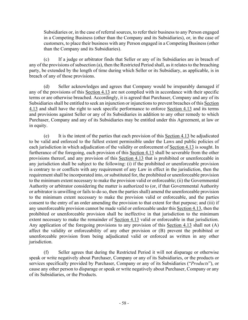 -58-附属公司,或在转介来源的情况下,将其业务转介给任何从事竞争业务的人(公司及其附属公司除外),或在客户的情况下,将其业务置于任何从事竞争业务的人(公司及其附属公司除外)。(c)如法官或仲裁员裁定卖方或其任何附属公司违反(a)款的任何规定,则有关违约方的限制期应按卖方或其附属公司(如适用)违反任何该等规定的期限延长。(d)卖方承认并同意,如果本第4.13条的任何规定未按照其具体条款得到遵守或以其他方式被违反,公司将受到不可挽回的损害。据此,同意买方、公司及其任何子公司有权寻求一项或多项禁令以防止违反本第4.13条,并有权寻求具体履行,以对卖方或其任何子公司强制执行第4.13条及其条款和规定,以及买方、公司及其任何子公司根据本协议可能有权在法律上或公平上获得的任何其他补救措施。(e)当事人的意图是,本第4.13条的每一项规定均被裁定为有效,并在寻求裁定第4.13条有效性或强制执行的每个法域的法律和公共政策允许的最大范围内予以执行。为促进上述规定,本条第4.13条的每项规定应与其其他规定分开,而本条第4.13条的任何规定在任何法域内被禁止或不可执行的,应受以下限制:(i)如被禁止或不可执行的规定与该法域内任何现行法律的任何要求相违背或相冲突,则该要求应并入或取代,禁止或不可执行的规定,达到使该规定有效或可执行所需的最低限度;(ii)考虑该事项的政府当局或仲裁员被授权(或者,如果该政府当局或仲裁员不愿意或没有这样做,则当事人应)在使该规定有效或可执行所需的最低限度内修改该不可执行的规定,并且当事人同意为此目的输入在该范围内修改该规定的命令;以及(iii)如果任何不可执行的规定根据本条4.13不能使其有效或可执行,那么,被禁止或不可执行的规定应在该司法管辖区内以使第4.13节的其余部分在该司法管辖区内有效或可执行所需的最低限度为无效。上述条文适用于本条第4.13条的任何条文,不得(a)影响任何其他条文的有效性或可执行性,或(b)阻止被禁止或不可执行的条文在任何其他司法管辖区被裁定为有效或按书面形式强制执行。(f)卖方同意,在限制期内,其不会诋毁或以其他方式对买方、公司或其任何子公司,或买方、公司或其任何子公司具体提供的产品或服务(“产品”)发表负面评论或撰写负面评论,或导致任何其他人诋毁或对买方、公司或其任何子公司或产品发表负面评论或撰写负面评论或撰写负面评论或撰写负面评论或撰写负面评论或撰写负面评论或撰写负面评论或撰写负面评论或撰写负面评论或撰写负面评论或撰写负面评论或撰写负面评论或撰写负面评论或撰写评论或撰写负面评论或撰写负面评论或撰写评论或撰写负面评论或撰写评论或撰写负面评论或撰写评论或撰写负面评论或撰写评论或撰写评论或撰写评论或撰写评论或撰写评论或撰写评论或撰写评论或