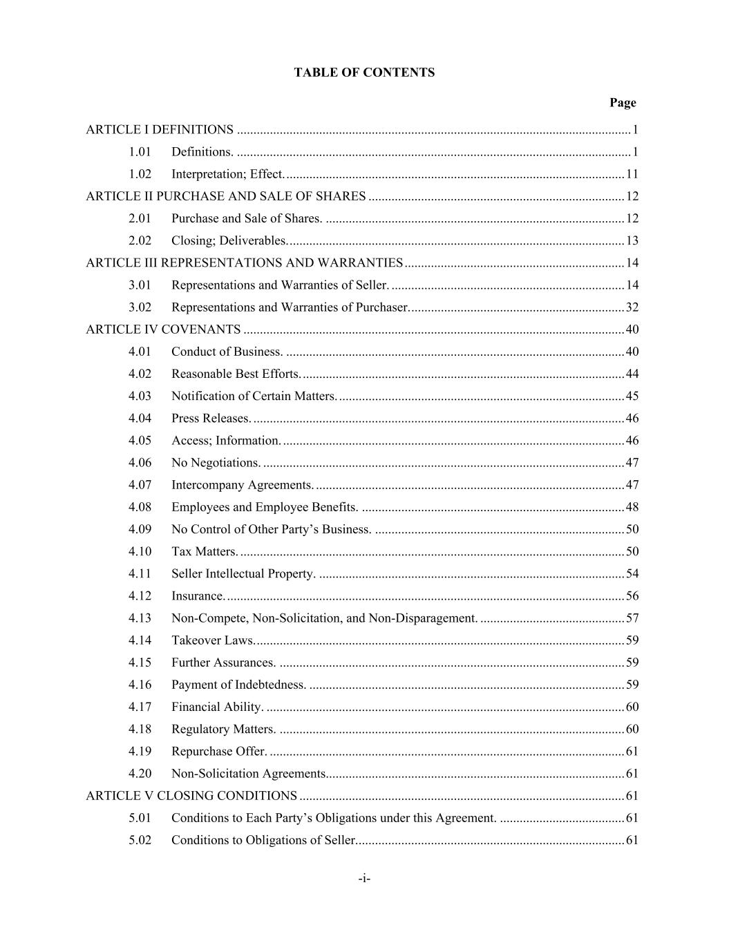 目录页-i-第一条定义.................................................................................................................... 11.01定义。.................................................................................................... 11.02释义;效果。......................................................................................11第二条买卖股份......................................................................................12 2.01买卖股份。....................................................................................12 2.02收盘;可交付成果。......................................................................................13第三条陈述和保证...................................................................................14 3.01卖方的陈述和保证。......................................................................14 3.02买方的陈述和保证。....................................................................32第四条盟约....................................................................................................40 4.01经营行为。.................................................................................... 404.02合理的最大努力。..................................................................................................4 44.03若干事项的通知。...................................................................................454.04新闻稿。.....................................................................................................................46 4.05存取;信息。.....................................................................................46 4.06没有谈判。......................................................................................................47 4.07公司间协议。......................................................................................47 4.08雇员和雇员福利。...................................................................................48 4.09不得控制他人业务。....................................................................50 4.10税务事项。.....................................................................................................50 4.11卖方知识产权。.....................................................................................54 4.12保险。...................................................................................................................56 4.13非竞争、非招揽、非诋毁。...................................................57 4.14接管法律。...................................................................................................59 4.15进一步保证。...................................................................................................59 4.16偿付债务。...................................................................................................59 4.17财务Ability。.....................................................................................................60 4.18监管事项。.................................................................................... 604.19回购要约。....................................................................................................61 4.20非征集协议....................................................................................61第五条结束条件...................................................................................................6 15.01各缔约方在本协议下的义务的条件。......................................6 15.02卖方义务的条件。................................................................................. 61