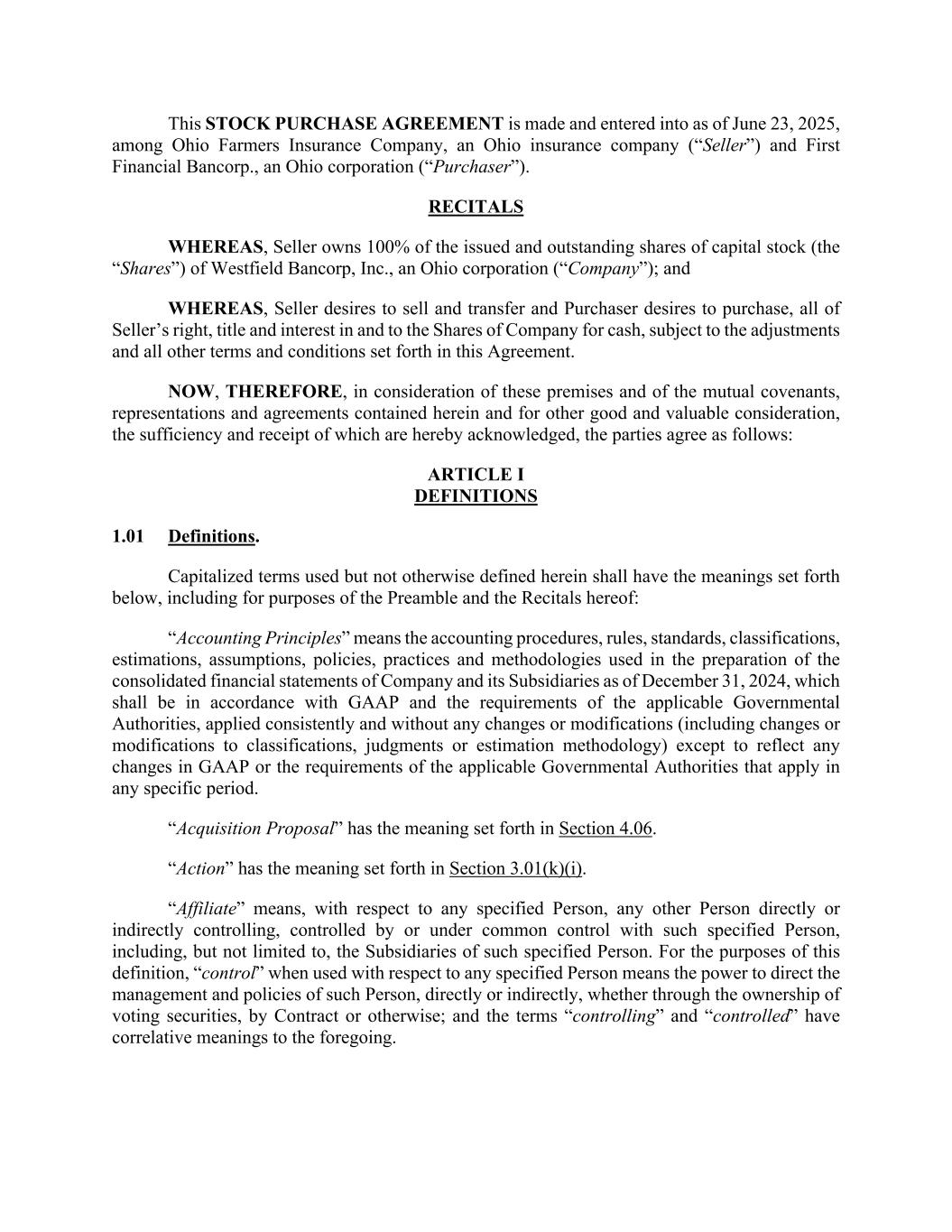 本股票购买协议由俄亥俄州保险公司Ohio Farmers Insurance Company(一家俄亥俄州保险公司)(“卖方”)与俄亥俄州公司(“买方”)第一金融银行股份()于2025年6月23日订立和订立。RECITALS WHEREAS,卖方拥有俄亥俄州公司Westfield Bancorp,Inc.(“公司”)100%的已发行和流通股本(“股份”);鉴于卖方希望出售和转让以及买方希望以现金购买卖方在公司股份中的所有权利、所有权和权益以及对公司股份的所有权益,但须遵守本协议中规定的调整和所有其他条款和条件。现在,因此,考虑到这些前提和本协议所载的相互盟约、陈述和协议以及其他良好和有价值的对价,兹确认其充分性和收回性,双方同意如下:第一条定义1.01的定义。此处使用但未另有定义的大写术语应具有下述含义,包括就序言和本说明而言:“会计原则”是指公司及其子公司截至2024年12月31日的合并财务报表编制过程中使用的会计程序、规则、标准、分类、估计、假设、政策、做法和方法,这些会计程序、规则、标准、分类、估计、假设、政策、做法和方法应按照公认会计原则和适用的政府当局的要求,一致适用,没有任何变更或修改(包括对分类的变更或修改,判断或估计方法),但反映GAAP的任何变化或适用于任何特定时期的适用政府当局的要求除外。“收购建议”具有第4.06节规定的含义。“行动”具有第3.01(k)(i)节规定的含义。“关联”是指,就任何特定人士而言,直接或间接控制、由该特定人士控制或与该特定人士共同控制的任何其他人士,包括但不限于该特定人士的附属公司。就本定义而言,“控制”在用于任何特定人员时,是指直接或间接地指导该人员的管理和政策的权力,无论是通过投票证券的所有权、通过合同或其他方式;“控制”和“控制”这两个词与上述具有相关含义。