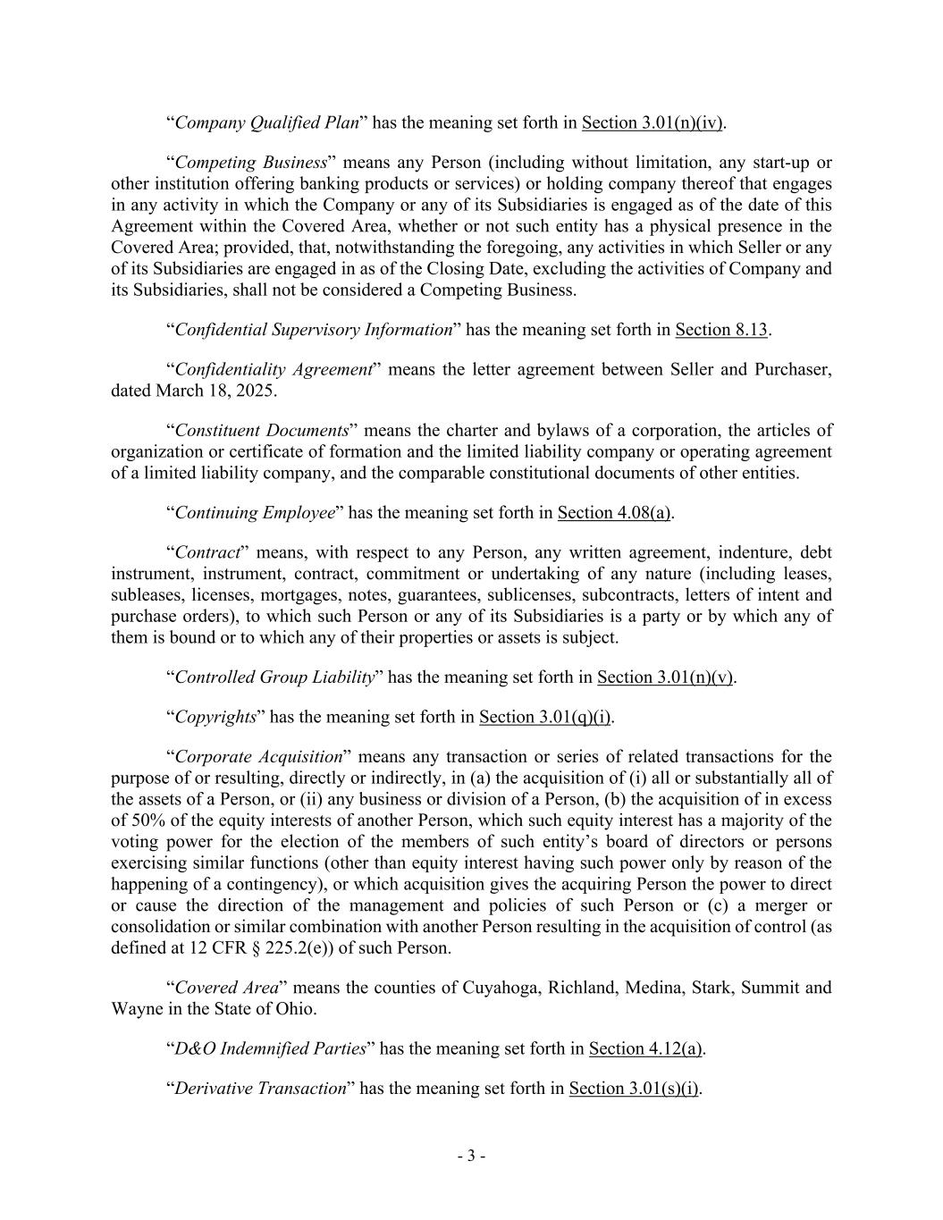 -3-“公司合格计划”具有第3.01(n)(iv)节中规定的含义。“竞争业务”指任何人(包括但不限于任何提供银行产品或服务的初创企业或其他机构)或其控股公司,在涵盖区域内从事公司或其任何子公司截至本协议日期所从事的任何活动,无论该实体是否在涵盖区域内有实体存在;条件是,尽管有上述规定,卖方或其任何子公司截至截止日期所从事的任何活动,不包括公司及其子公司的活动,不得视为竞争业务。“机密性监管信息”具有第8.13节规定的含义。“保密协议”指卖方和买方之间的信函协议,日期为2025年3月18日。“组成文件”是指公司章程和章程、组织章程或成立证明和有限责任公司的有限责任公司或经营协议,以及其他实体的可比组成文件。“持续雇员”具有第4.08(a)节规定的含义。“合同”就任何人而言,是指任何书面协议、契约、债务文书、文书、合同、承诺或任何性质的承诺(包括租赁、转租、许可、抵押、票据、担保、、分许可、分包合同、意向书和定购单),该人或其任何子公司为一方或其中任何一方受其约束或其任何财产或资产受其约束。“受控集团责任”具有第3.01(n)(v)节规定的含义。“版权”具有第3.01(q)(i)节规定的含义。“企业收购”指任何交易或一系列关联交易,其目的或结果直接或间接在于(a)收购(i)一人的全部或几乎全部资产,或(ii)一人的任何业务或分部,(b)收购另一人超过50%的股权,该等股权在选举该实体的董事会成员或行使类似职能的人时拥有多数投票权(股权仅因或有事项的发生而拥有此类权力除外),或哪项收购赋予收购人权力来指导或导致该人的管理和政策的方向,或(c)与另一人的合并或合并或类似合并导致该人的控制权(定义见12 CFR § 225.2(e))的获得。“覆盖区域”是指俄亥俄州的凯霍加县、里奇兰县、梅迪纳县、斯塔克县、萨米特县和韦恩县。“D & O受偿方”具有第4.12(a)节规定的含义。“衍生交易”具有第3.01(s)(i)节规定的含义。